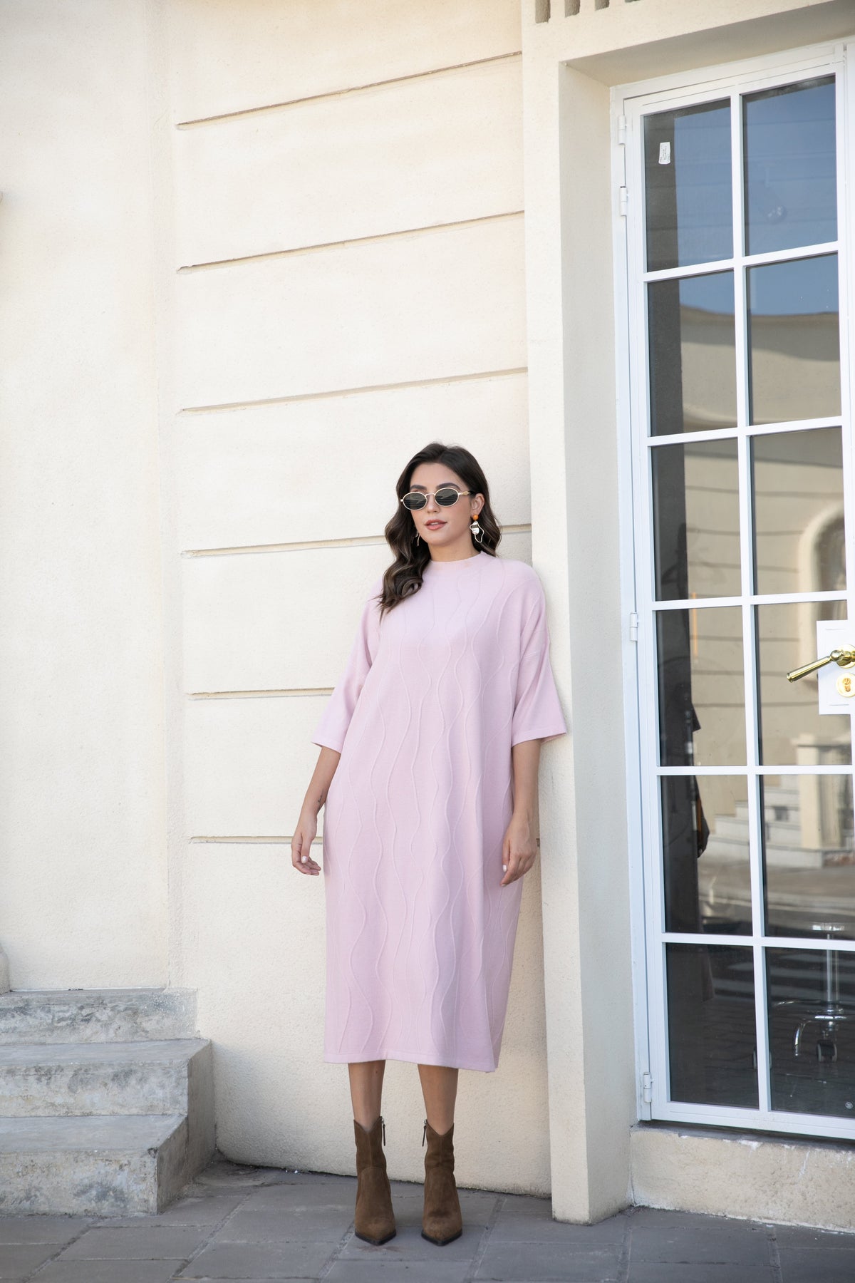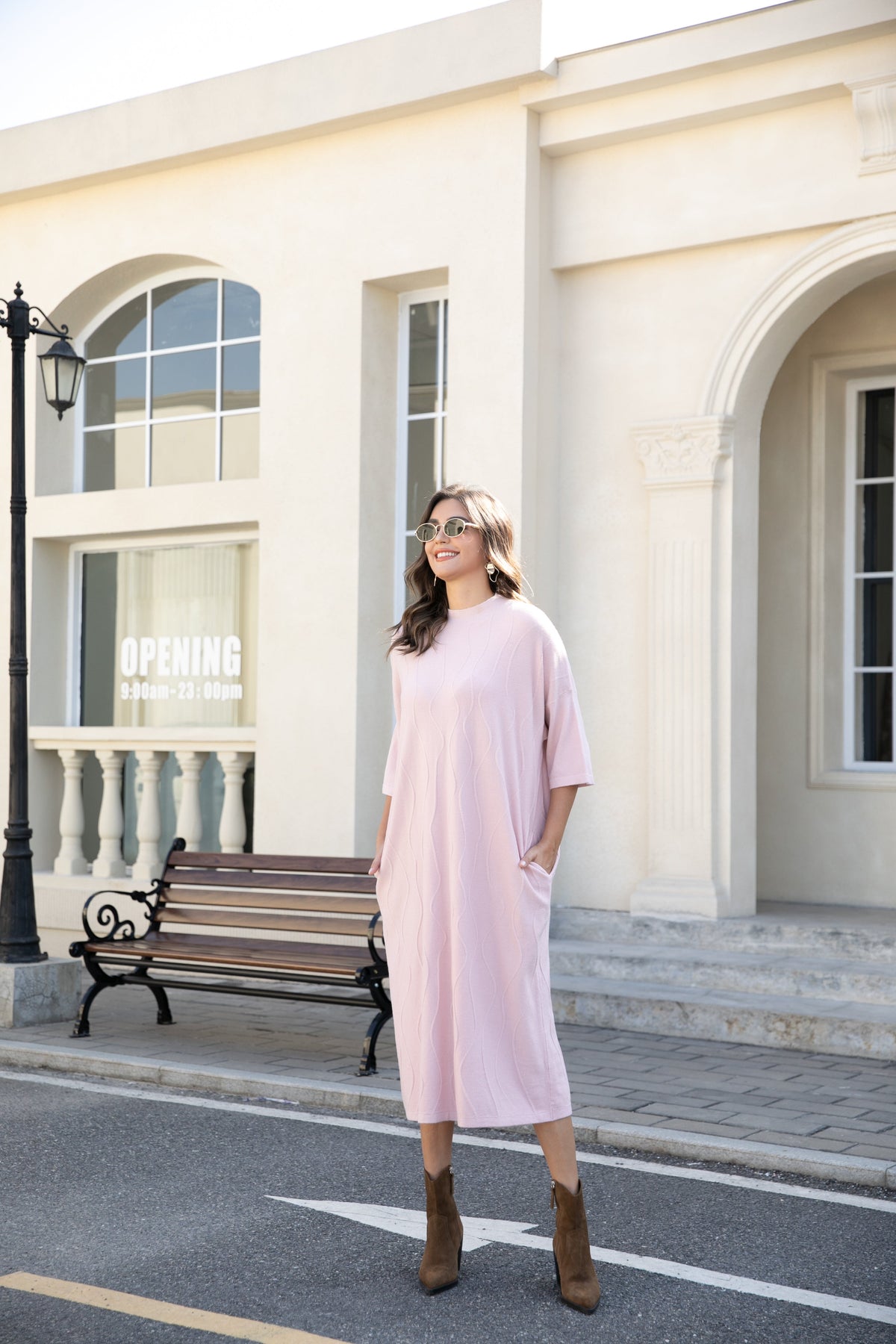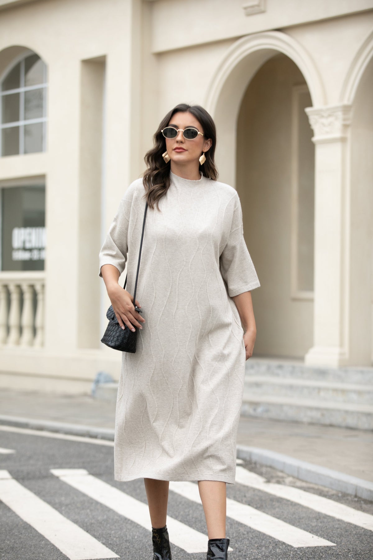 Expertly crafted with a jacquard knit front, the Regal Weave Sweater Dress adds a touch of texture to your wardrobe. This dress features a high-neck line and elbow sleeves, creating a stand-out look. Perfect for those who appreciate quality and unique style.