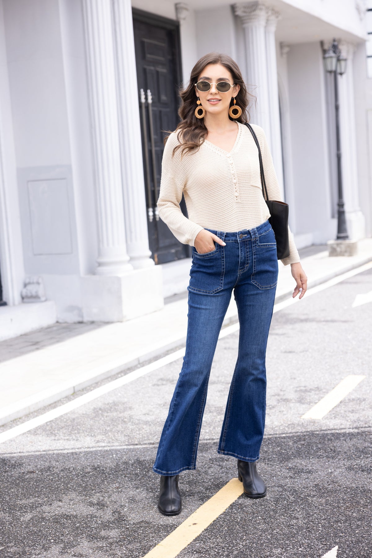 These flare jeans offer a practical, subtly flared leg that balances style and comfort without being over the top. Designed for easy wear, they feature dramatic pockets that add a fashionable edge while keeping the look simple and versatile. Perfect for everyday wear with a touch of flair.