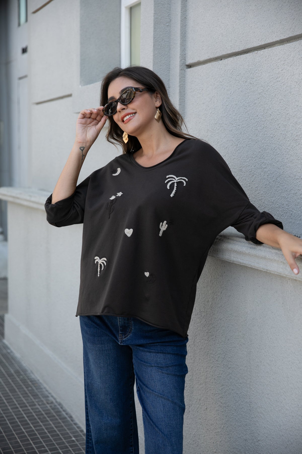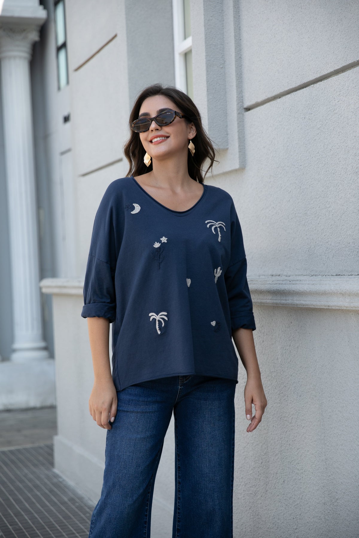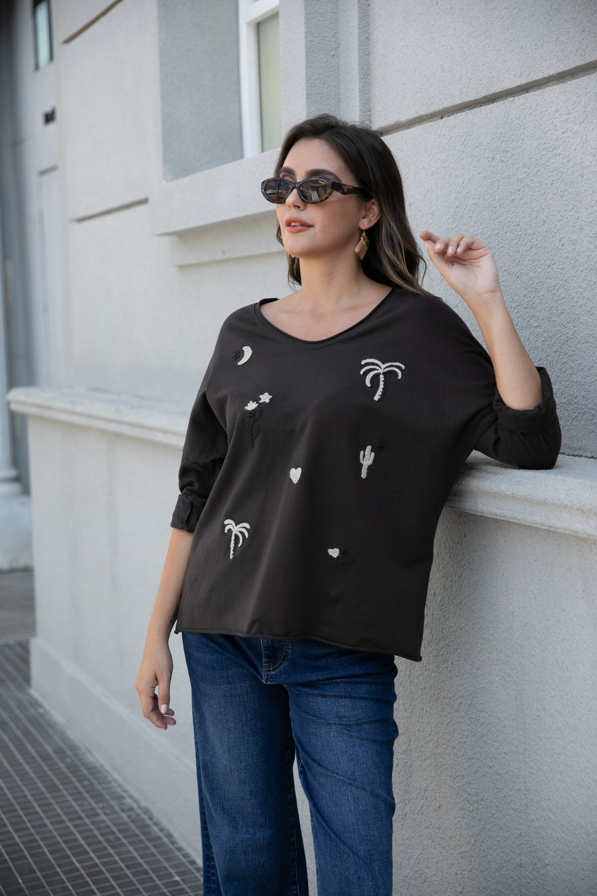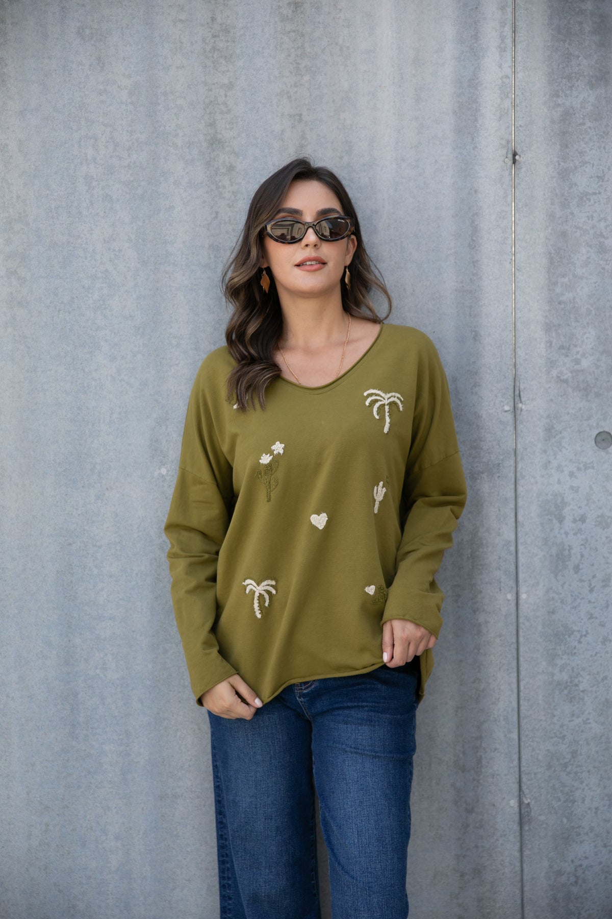 This fun and playful sweater top is made from soft French terry fabric and features a unique v-neck design. The charming applique details, including palm trees, cactus, hearts, and crescents, add a touch of personality to this cozy piece. Perfect for adding a touch of fun to any outfit.