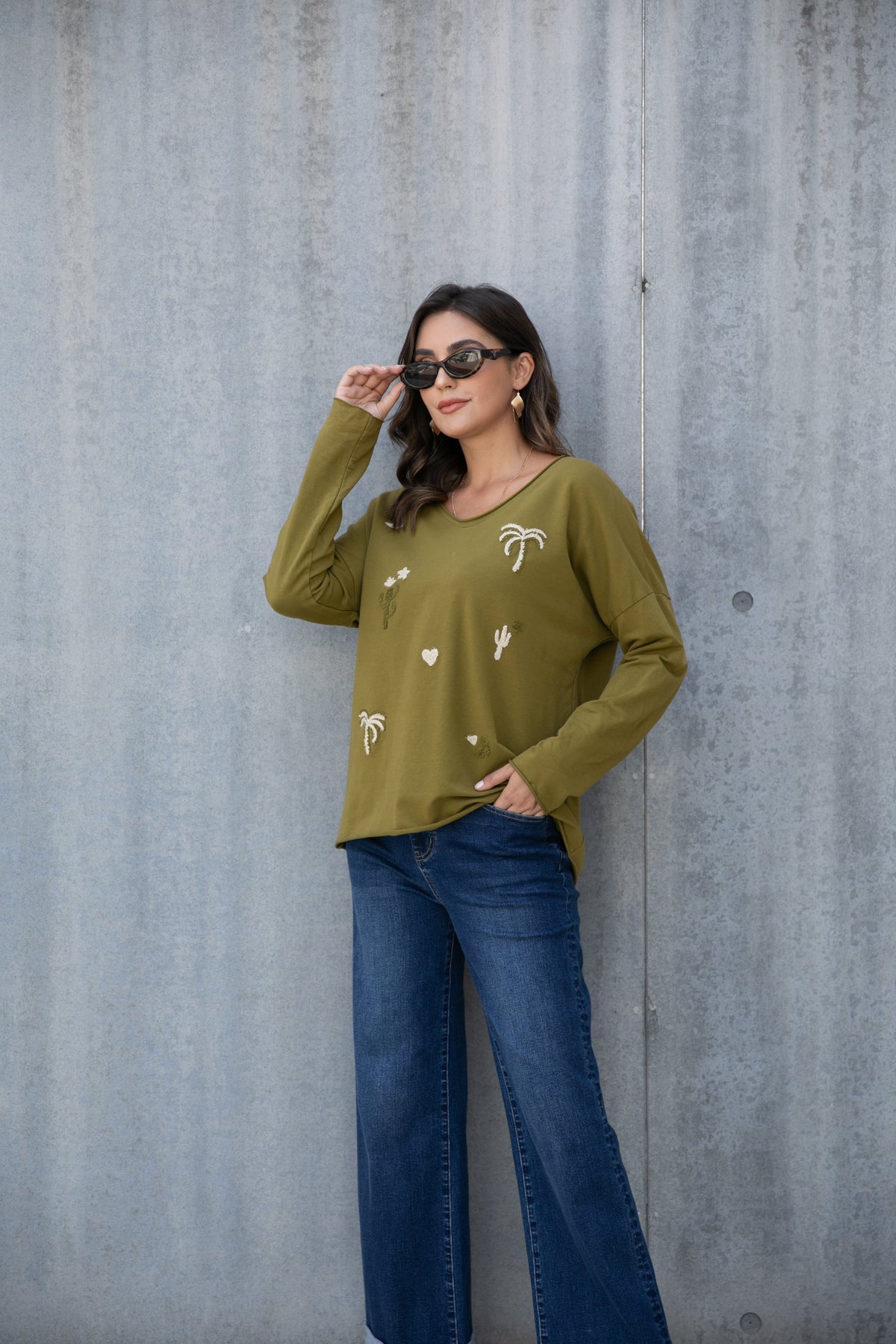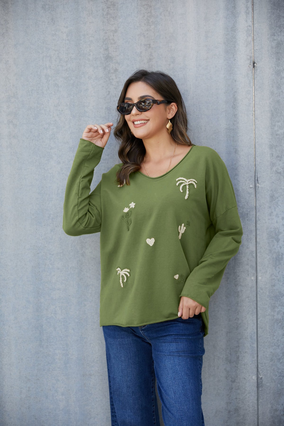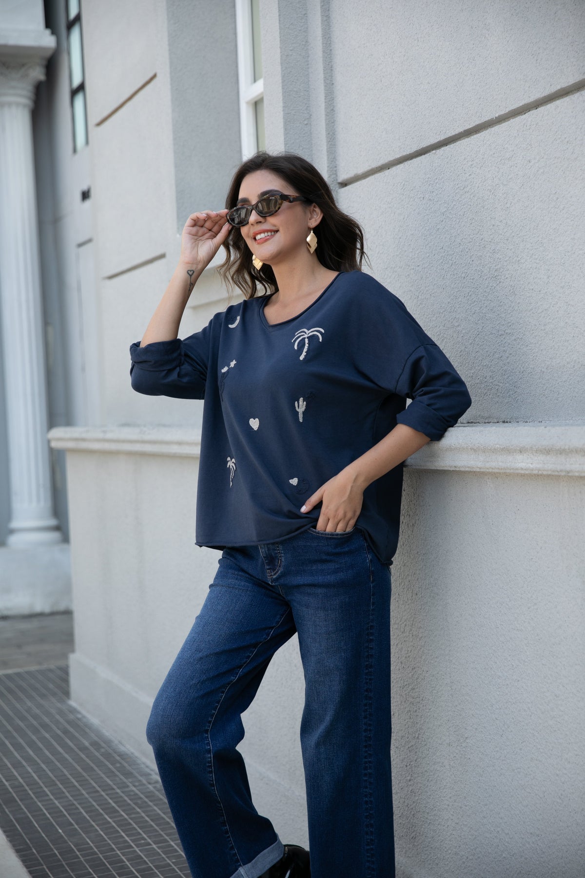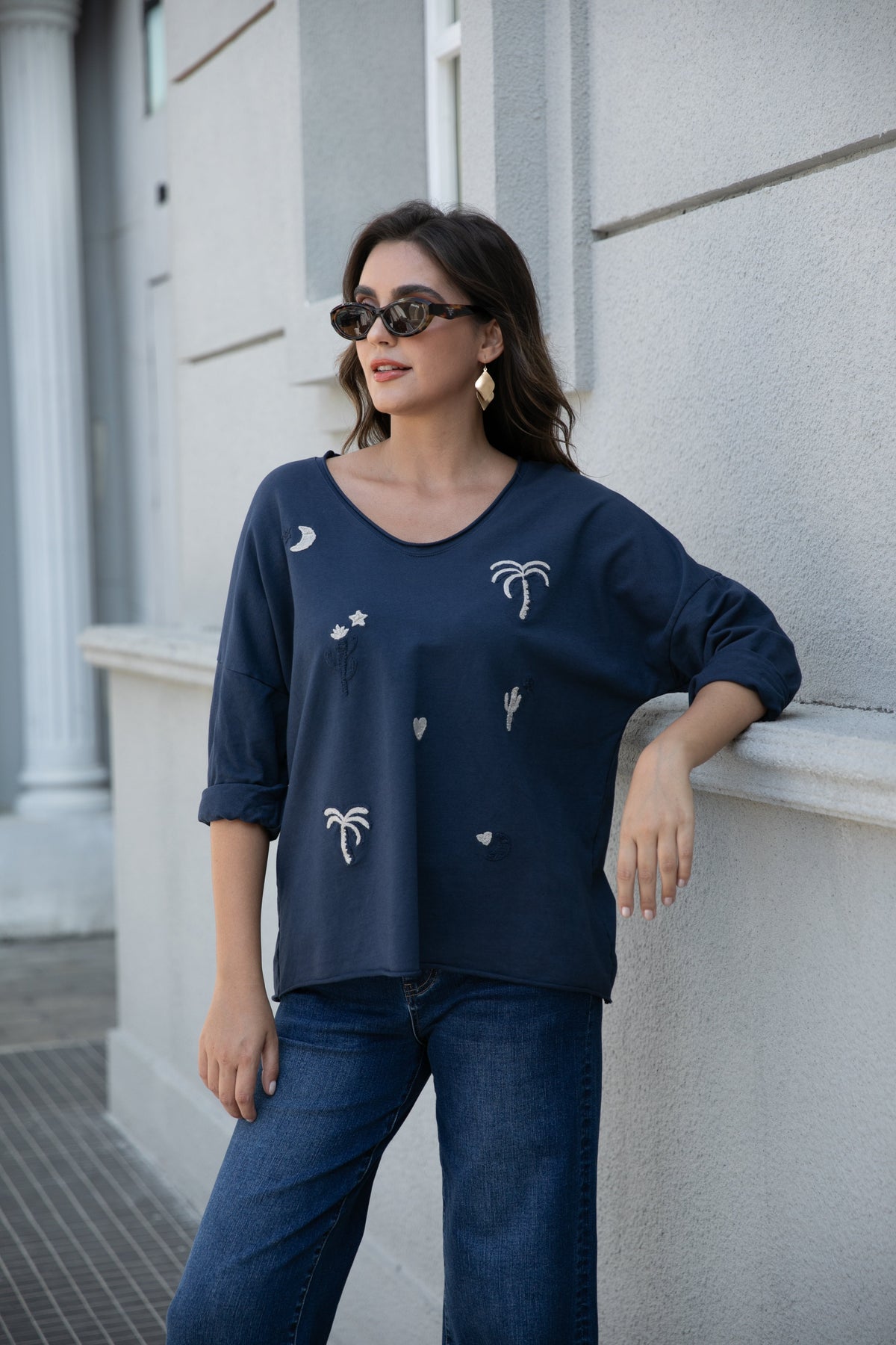This fun and playful sweater top is made from soft French terry fabric and features a unique v-neck design. The charming applique details, including palm trees, cactus, hearts, and crescents, add a touch of personality to this cozy piece. Perfect for adding a touch of fun to any outfit.