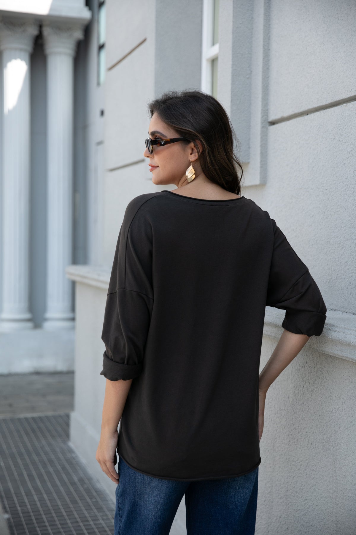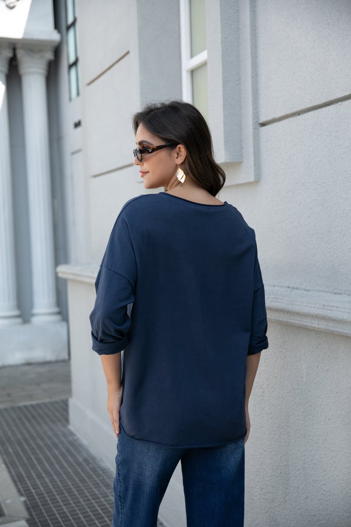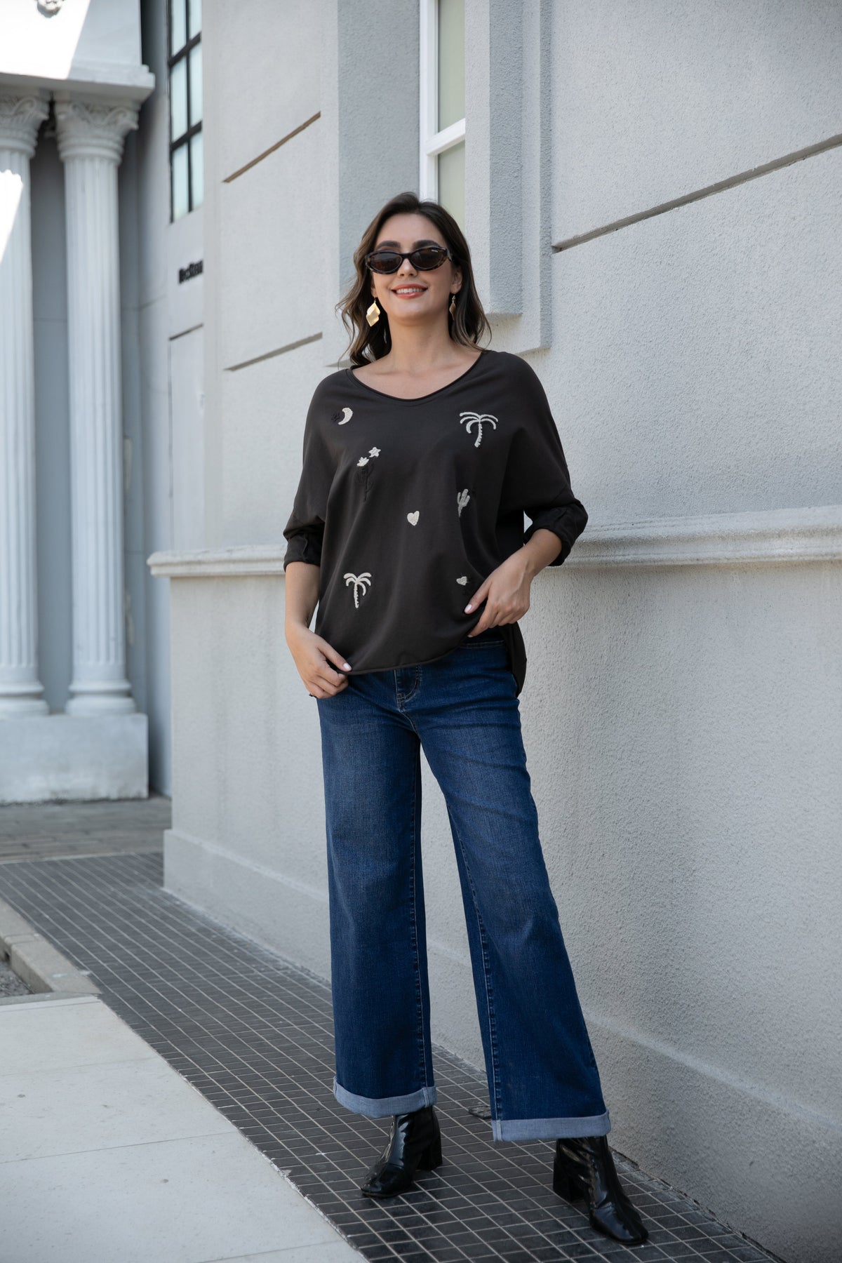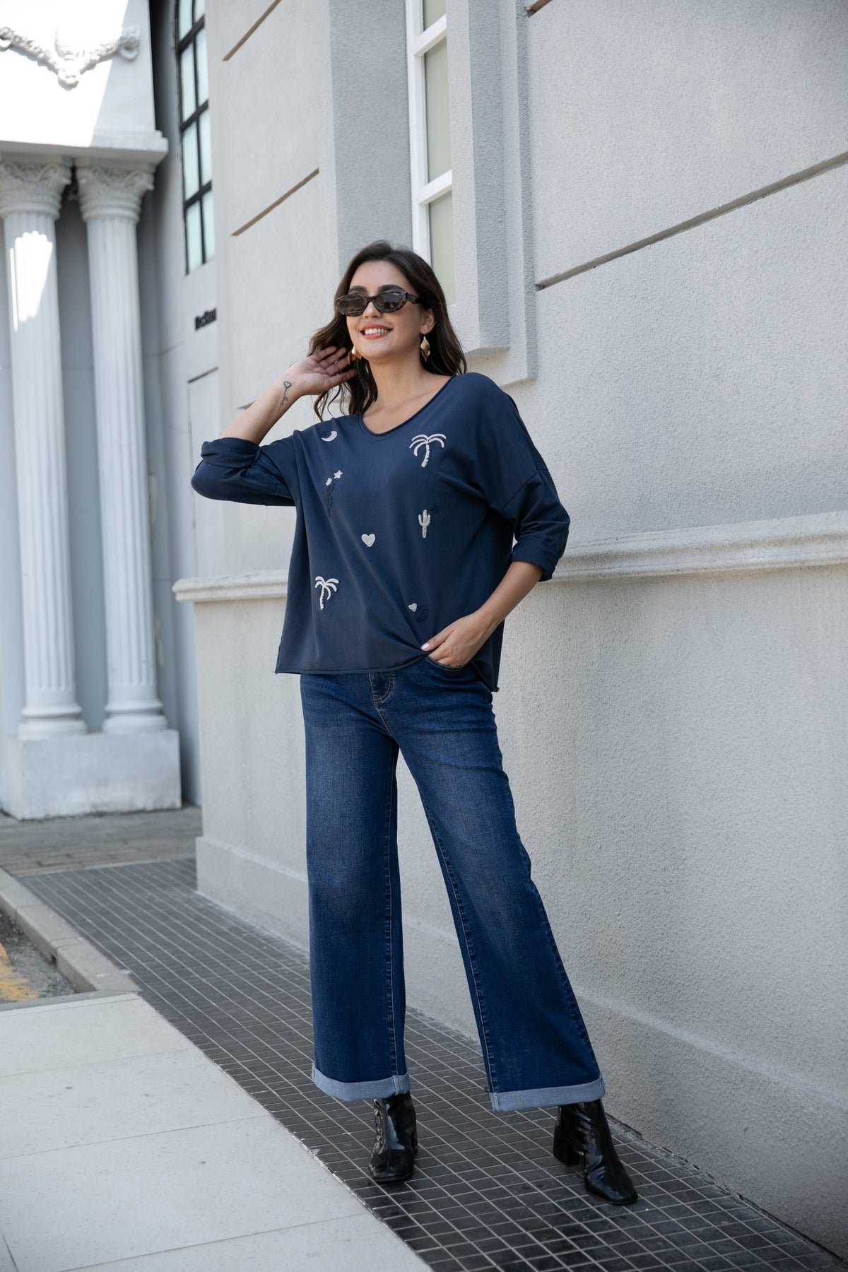 This fun and playful sweater top is made from soft French terry fabric and features a unique v-neck design. The charming applique details, including palm trees, cactus, hearts, and crescents, add a touch of personality to this cozy piece. Perfect for adding a touch of fun to any outfit.