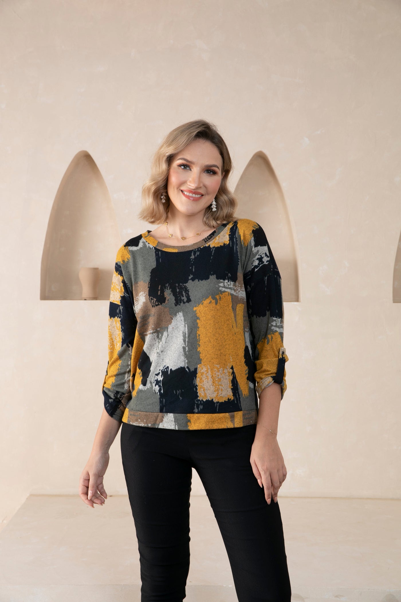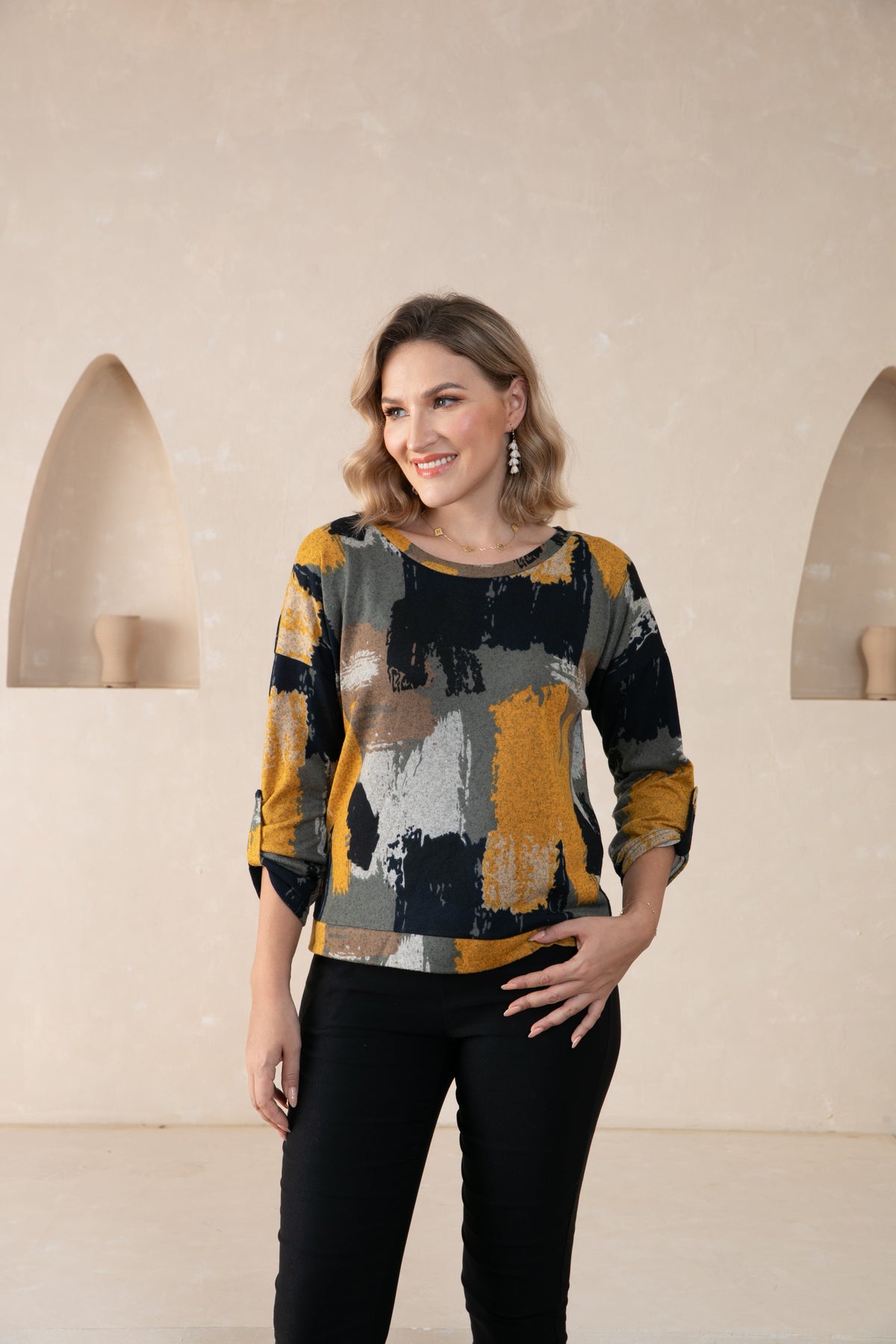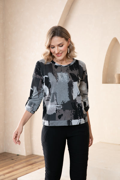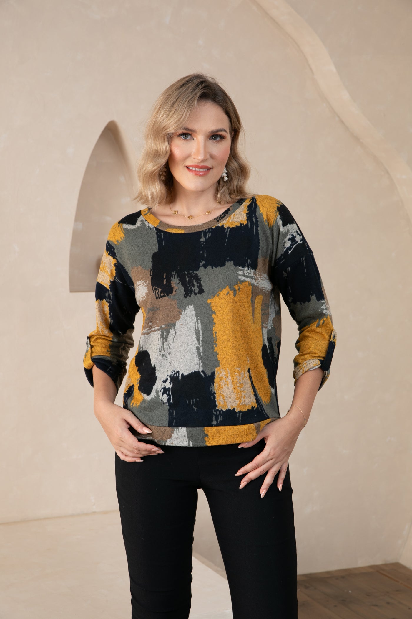Introducing the "Artistic Comfort Round Neck Top," a versatile and cozy addition to your wardrobe. Crafted from soft jersey knit fabric, this top features a stylish abstract pattern that adds a touch of artistic flair to your ensemble.