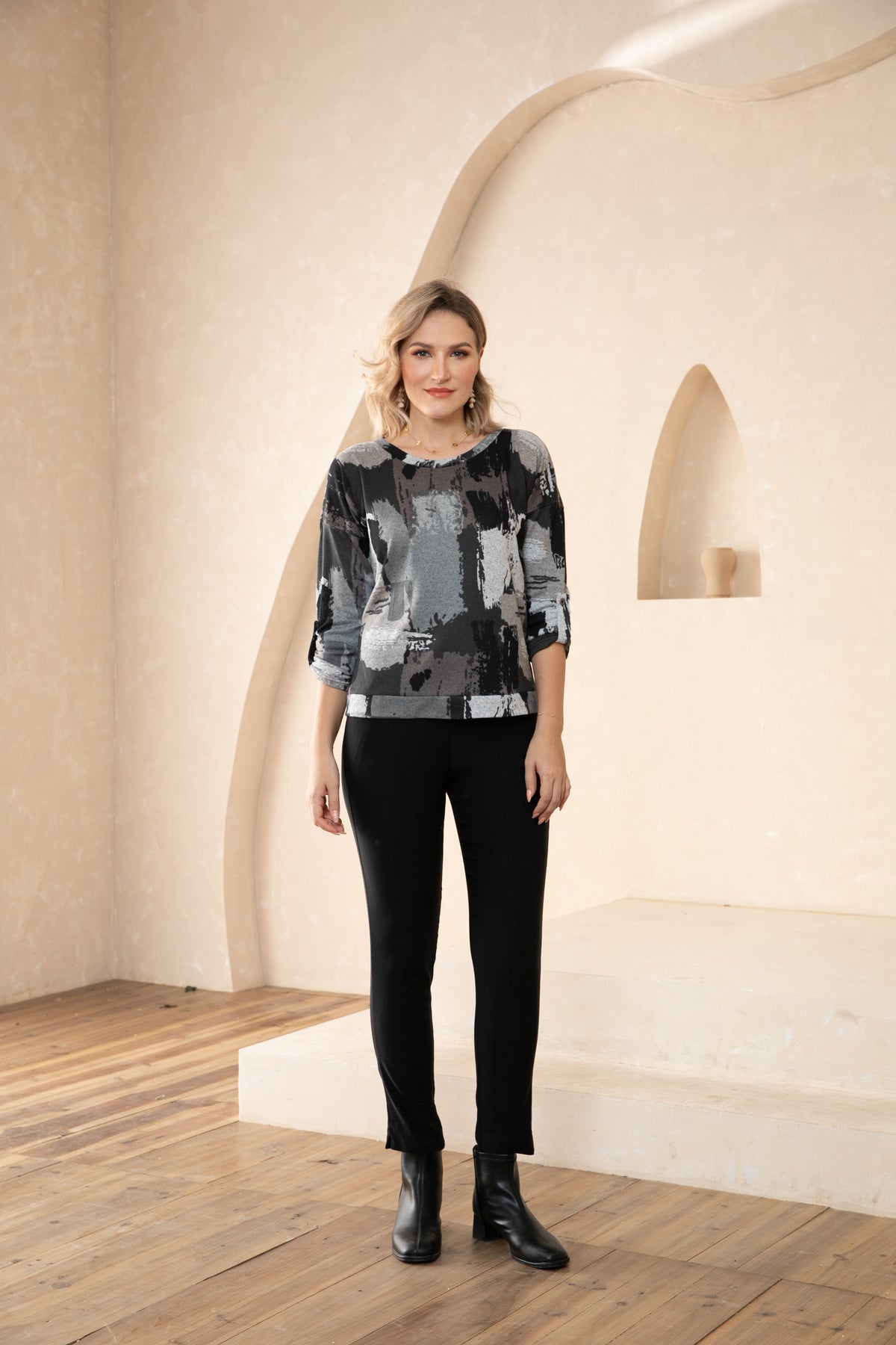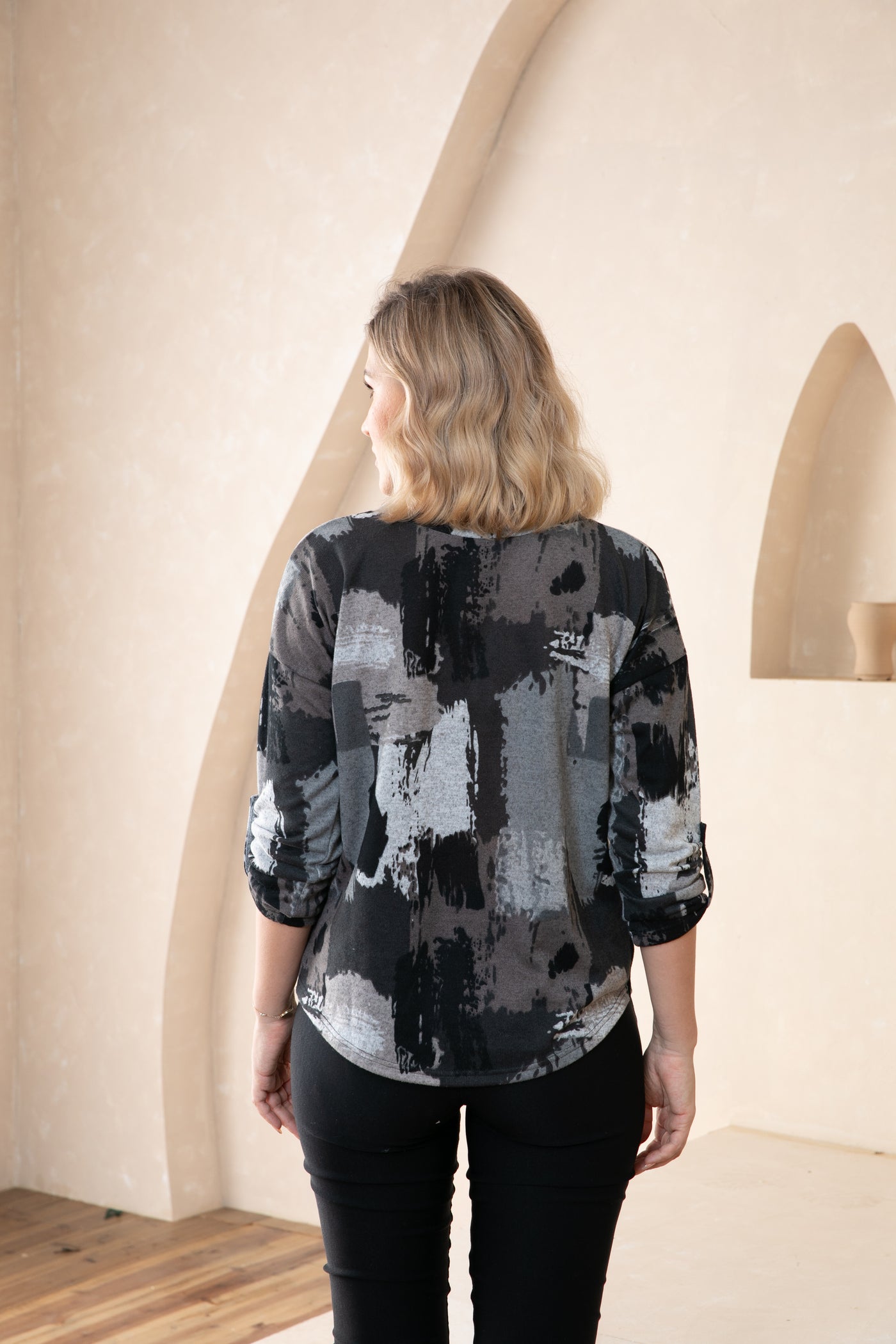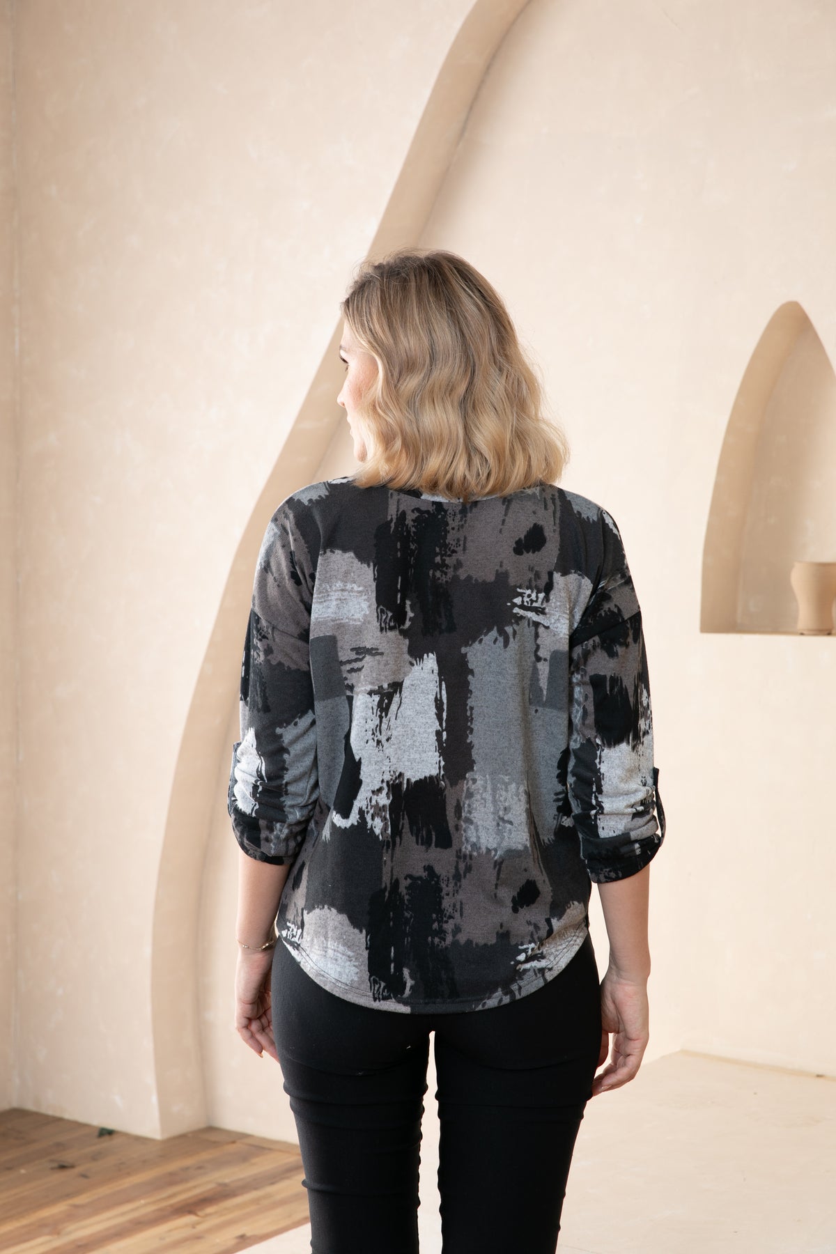 Introducing the "Artistic Comfort Round Neck Top," a versatile and cozy addition to your wardrobe. Crafted from soft jersey knit fabric, this top features a stylish abstract pattern that adds a touch of artistic flair to your ensemble.