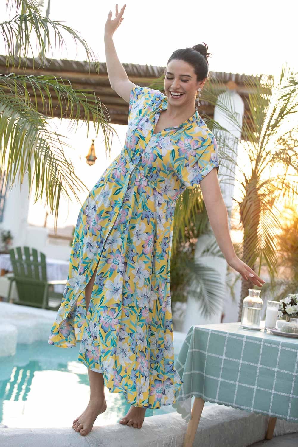 The beautiful Button Up Floral Dress with its gorgeous colorful print will keep you cool and will make you feel comfortable in summer.