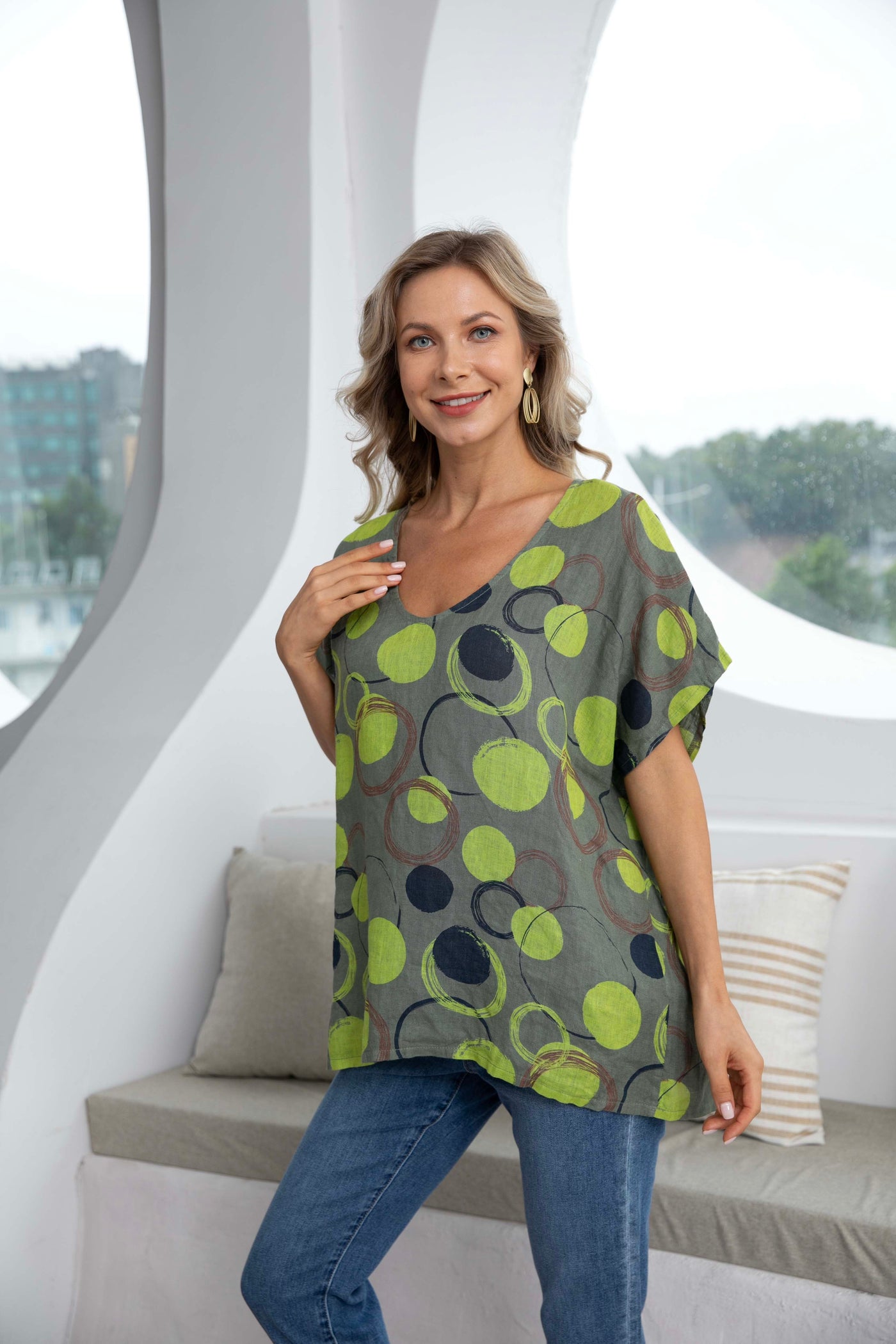 Welcome to elegance with Angelica's Bubble Print Top. This luxurious top is expertly crafted in Italy with 100% linen, providing comfort and breathability. The unique bubble print adds a touch of sophistication to the European design. Elevate your wardrobe with this exclusive piece of art.