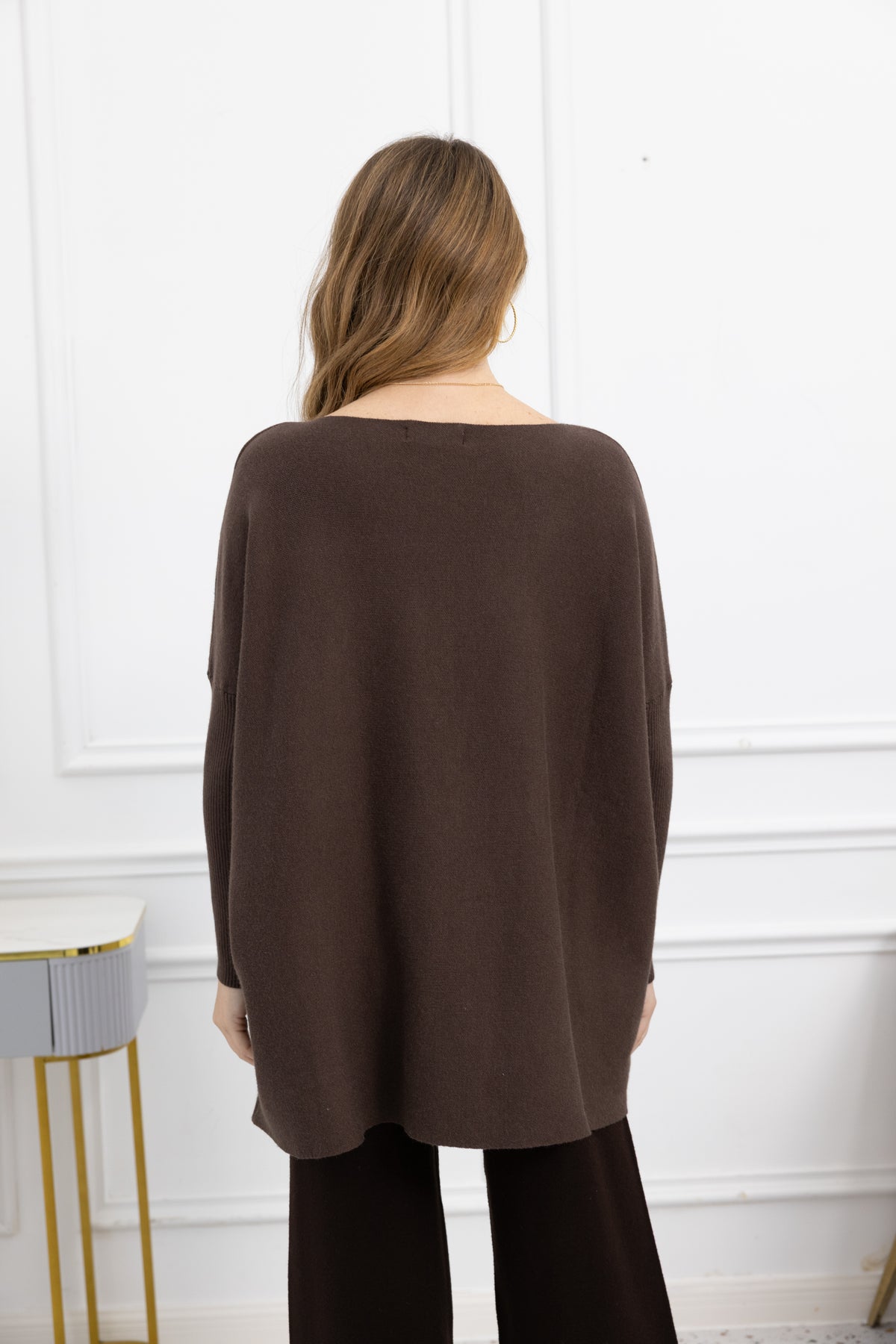 With its boatneck neckline and long sleeves, this sweater offers a classic silhouette that is both versatile and flattering. The relaxed dolman sleeves provide a comfortable and laid-back feel, allowing for ease of movement and a casual yet chic vibe.