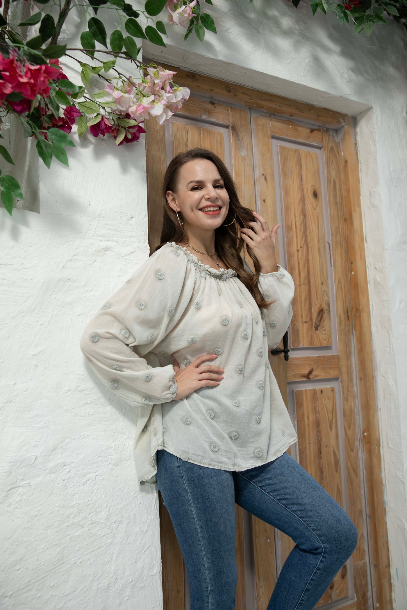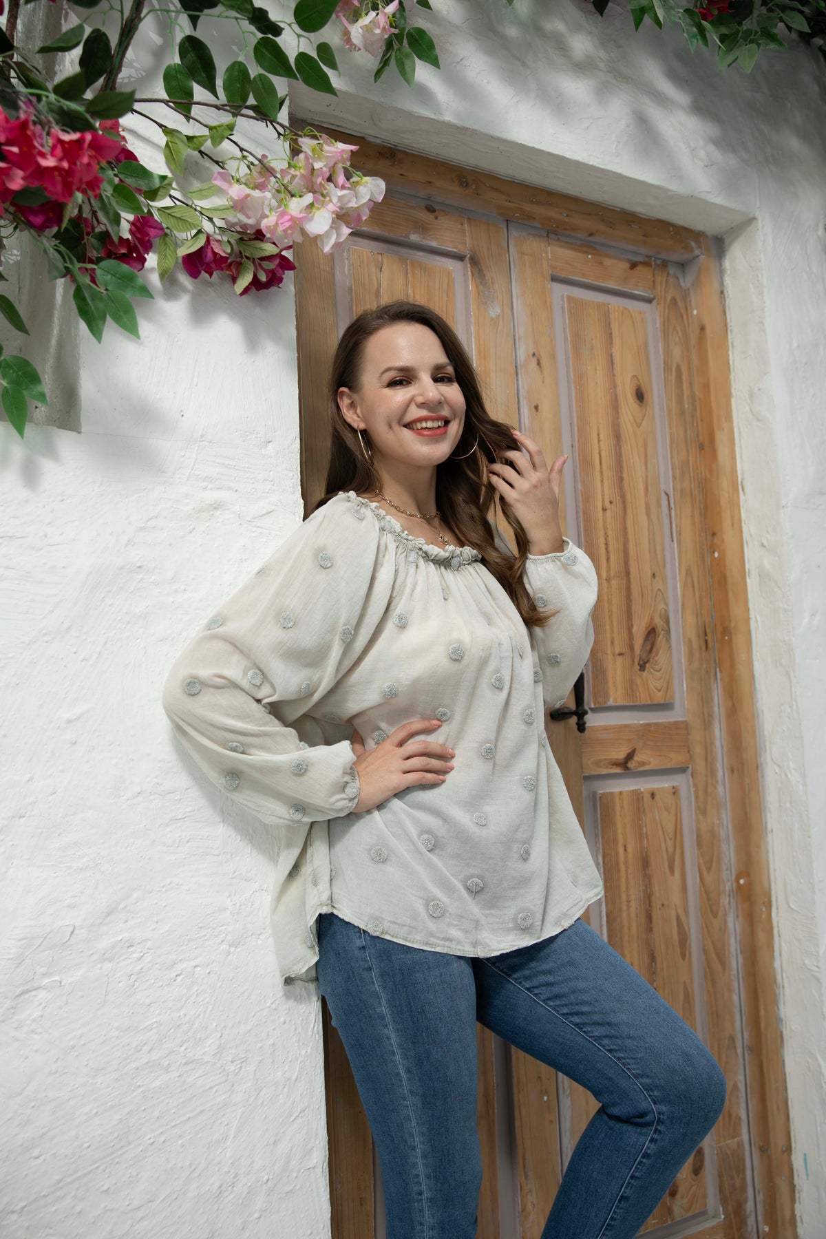 This elegant Penelope's polka dot applique features a frilly neck collar and abstract polka dots, exuding class and style. Its lightweight design adds to its sophistication, making it a must-have accessory for any fashion-forward individual. Instantly elevate your look with this stylish piece.