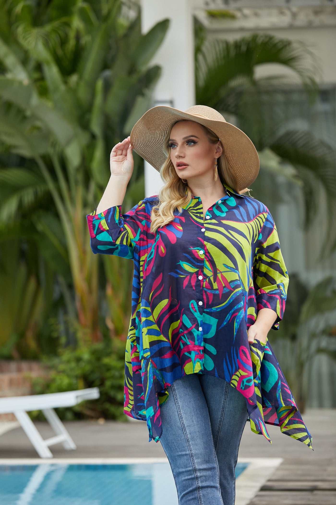 Introducing our printed cotton top - the perfect addition to your wardrobe! Made with lightweight cotton, this button-up blouse features a collar and 3/4 sleeves for a comfortable and stylish fit. The tropical jungle pattern and asymmetrical A-line shape add a touch of flair, while the pockets make it practical. Pair it with jeans for the ultimate chic look.