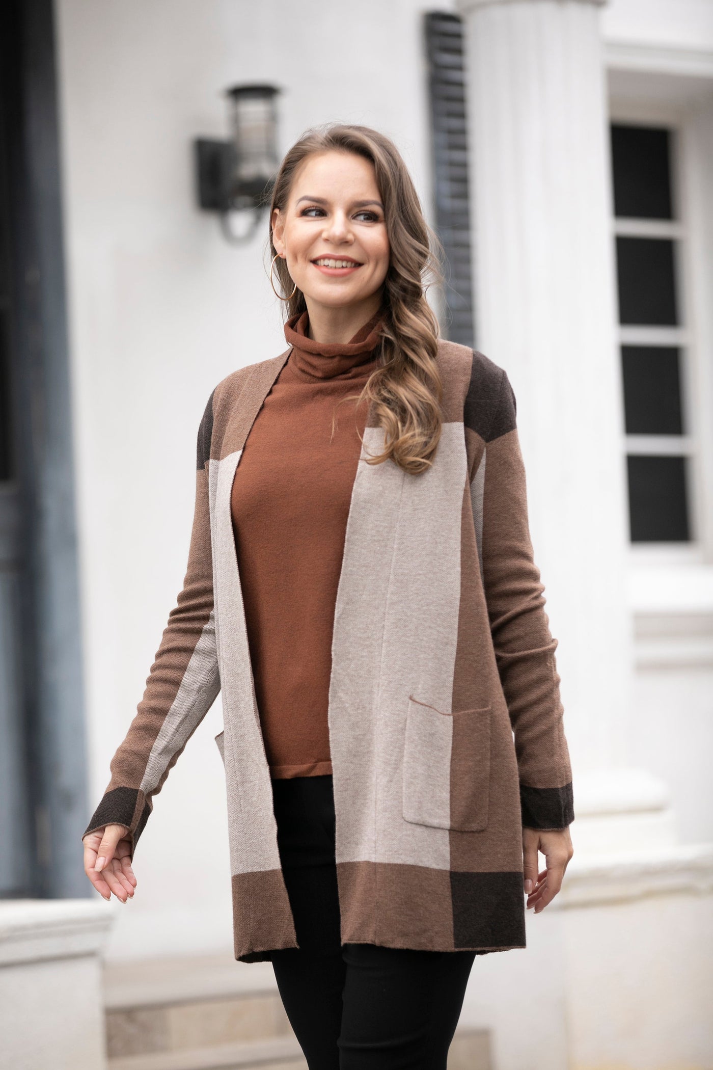 Our Color Block Knitted Cardigan, a chic and stylish piece that adds a pop of color to your wardrobe. This cardigan features a unique color block design, combining different shades to create a modern and eye-catching look.