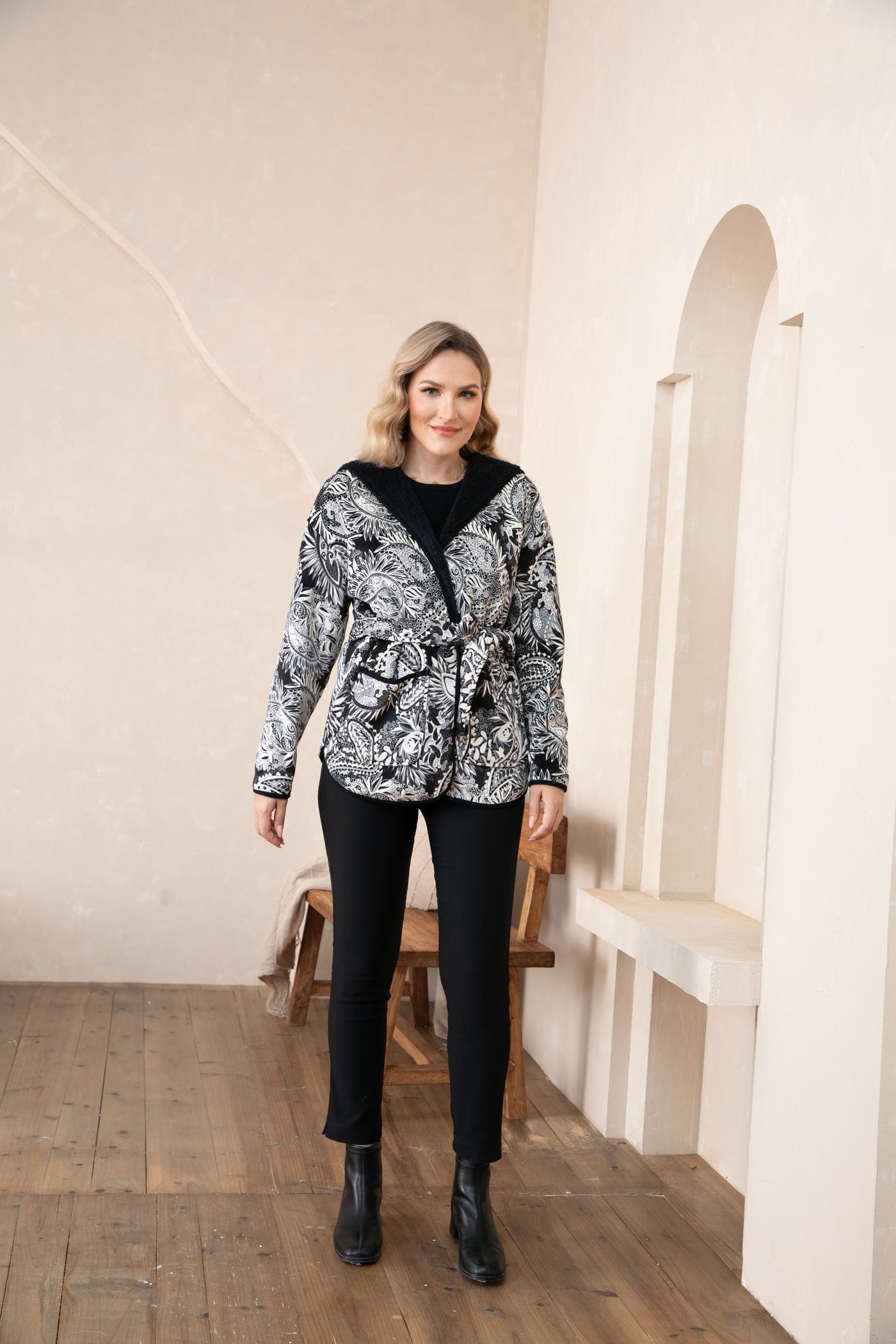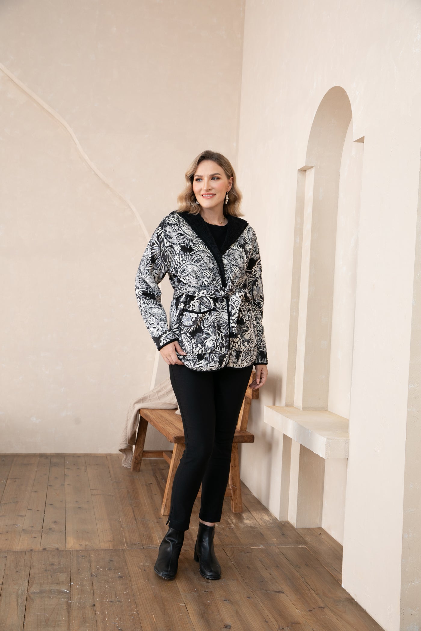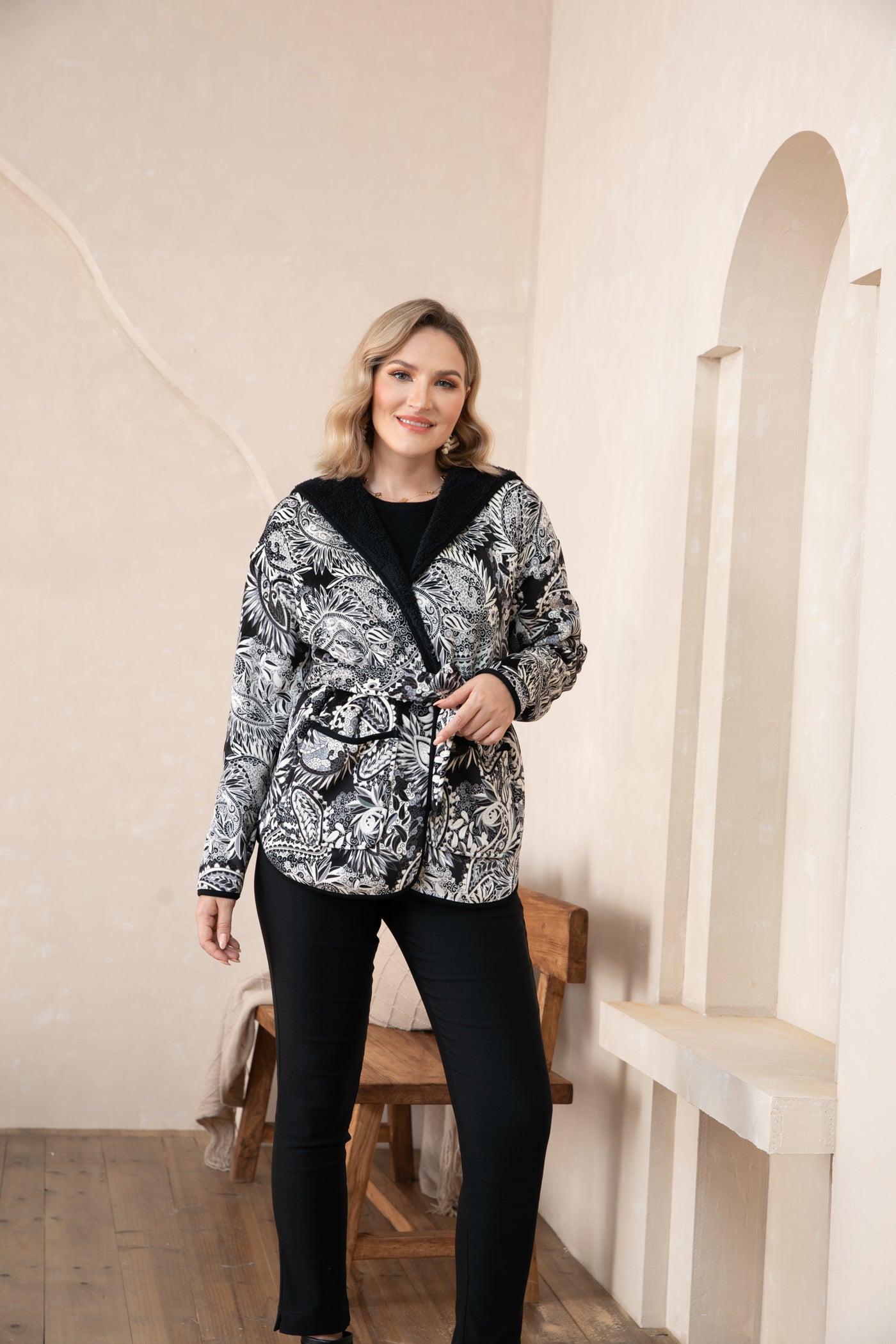 Conquer any adventure in Martha's Fleece Cardigan! With 2 bonded fleece fabrics, an intricate print, and a hood, this cardigan offers ultimate comfort and a phenomenal hand feel. Plus, it comes with pockets and a belt for added convenience. Dare to take on the day in style!