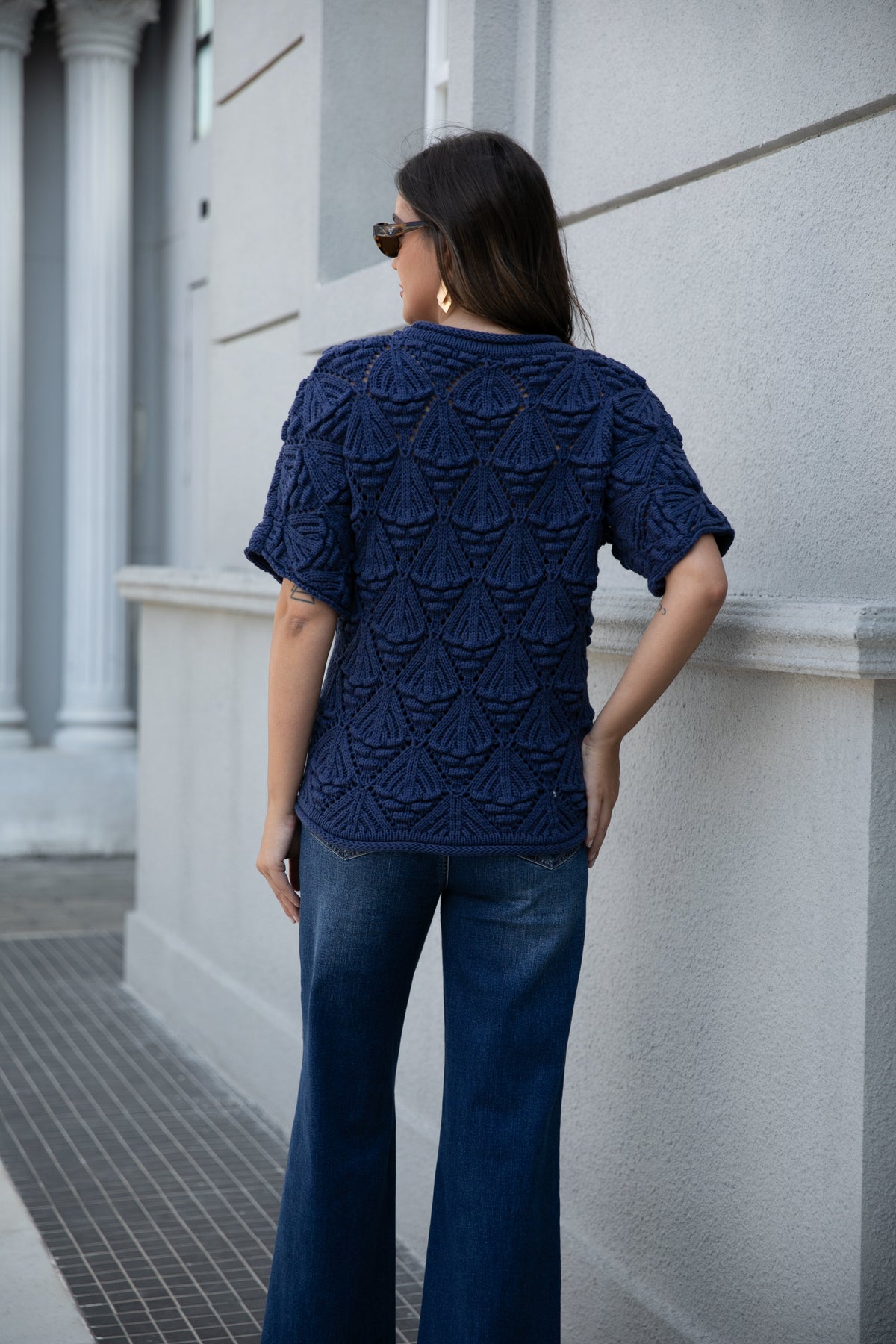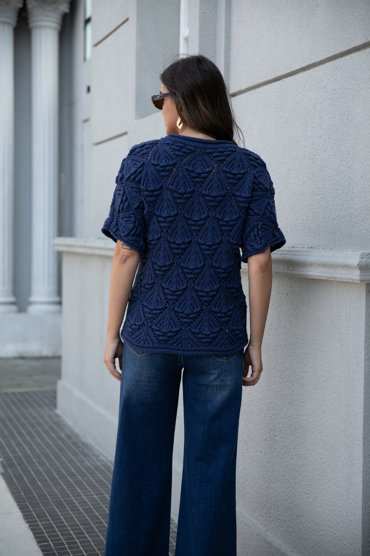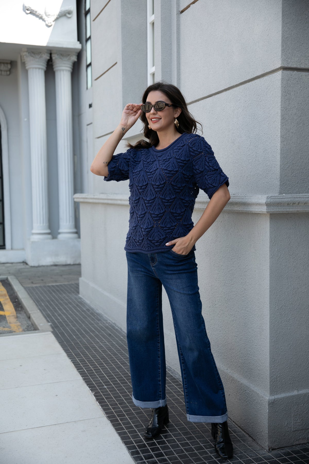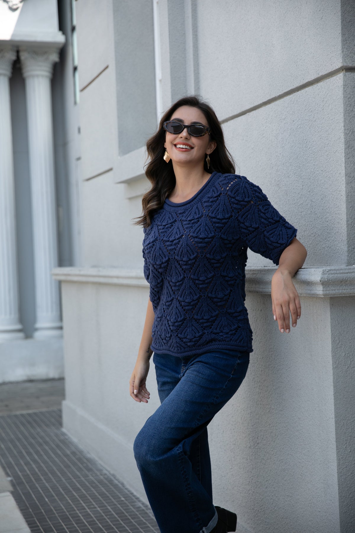 Expertly crafted with a pointelle knit in a diamond shape, Arabella's Top adds texture and dimension to any outfit. The elbow sleeves and soft colors offer a touch of sophistication and versatility. Elevate your wardrobe with this timeless piece.