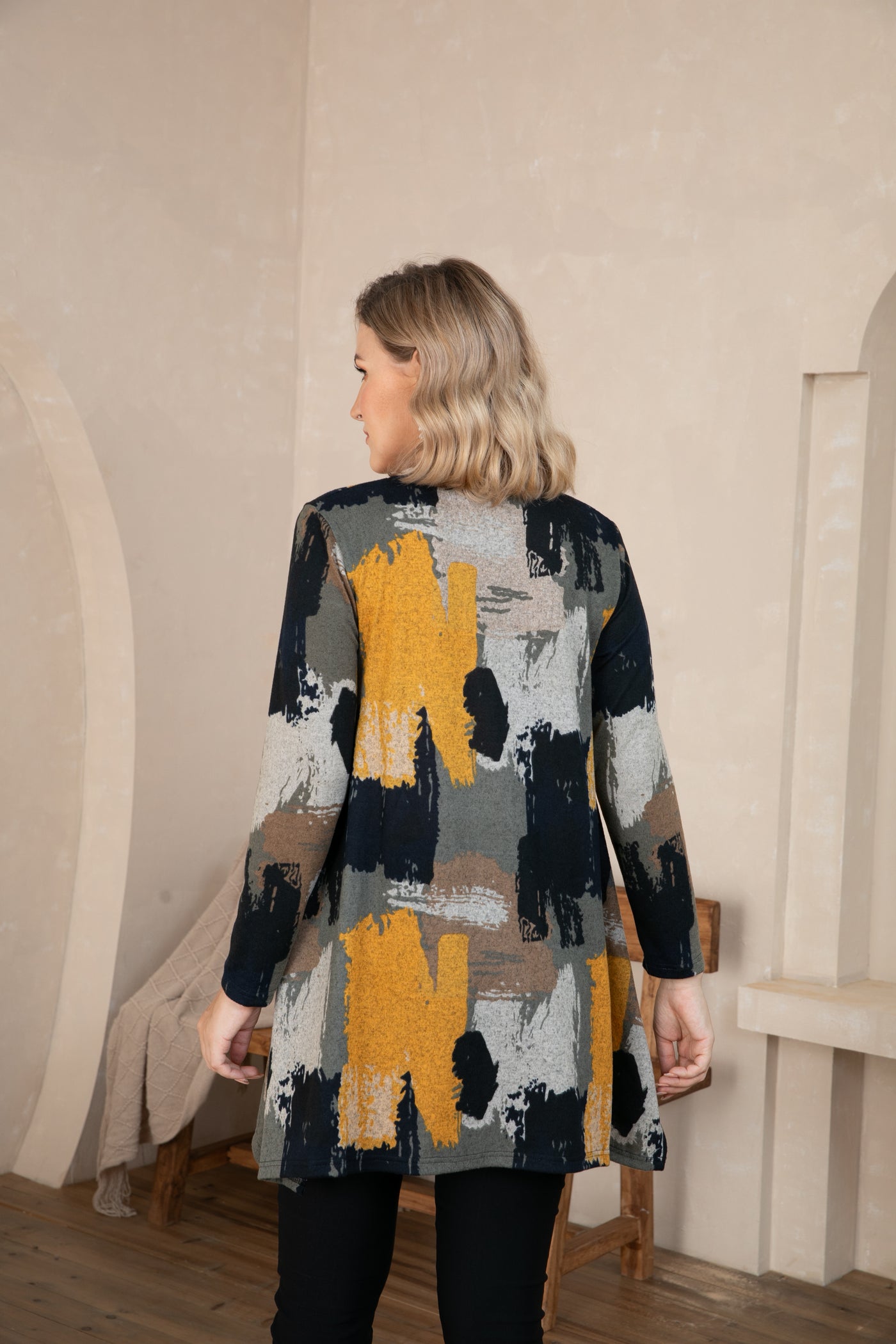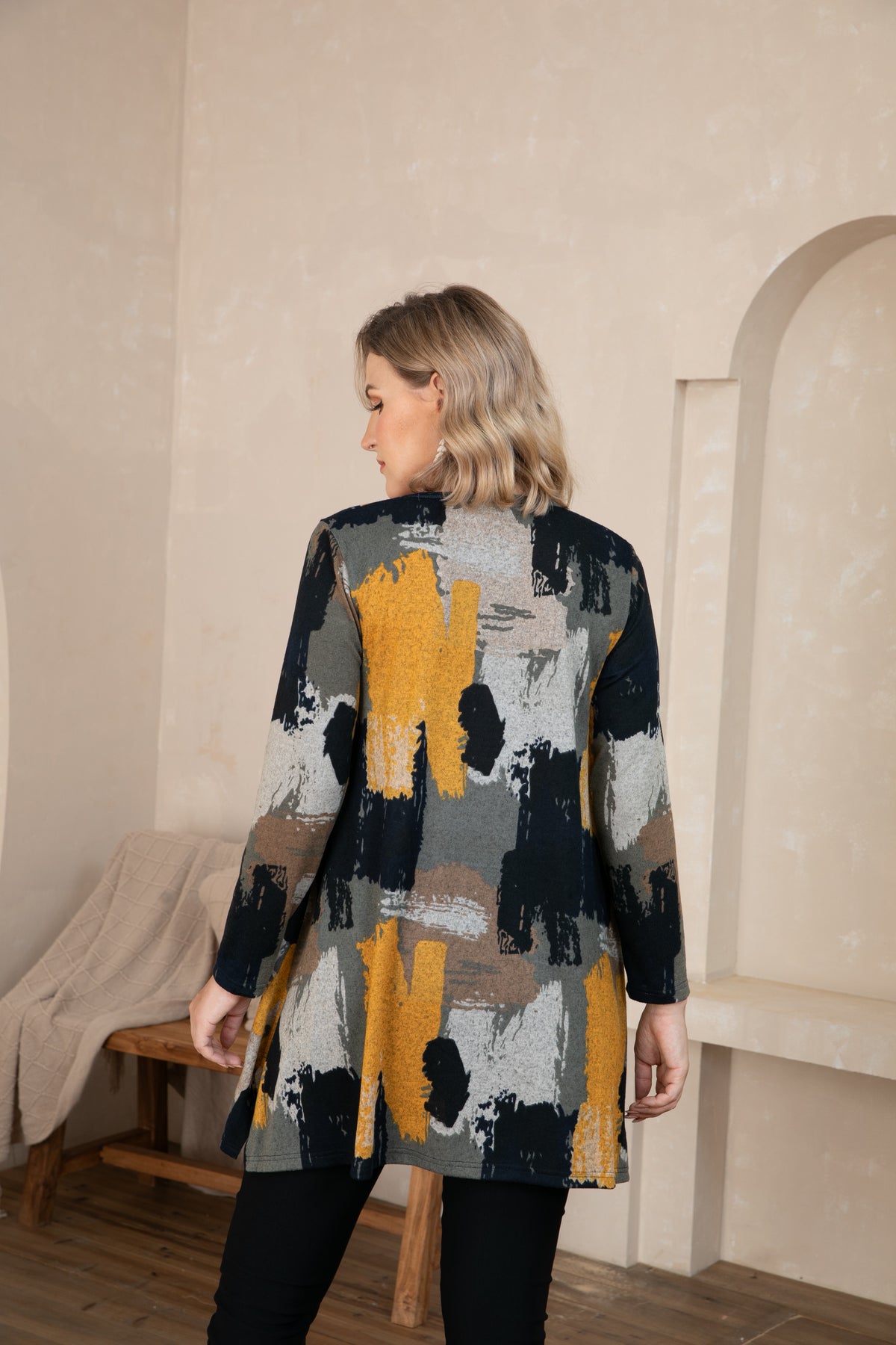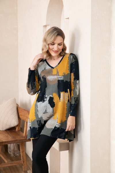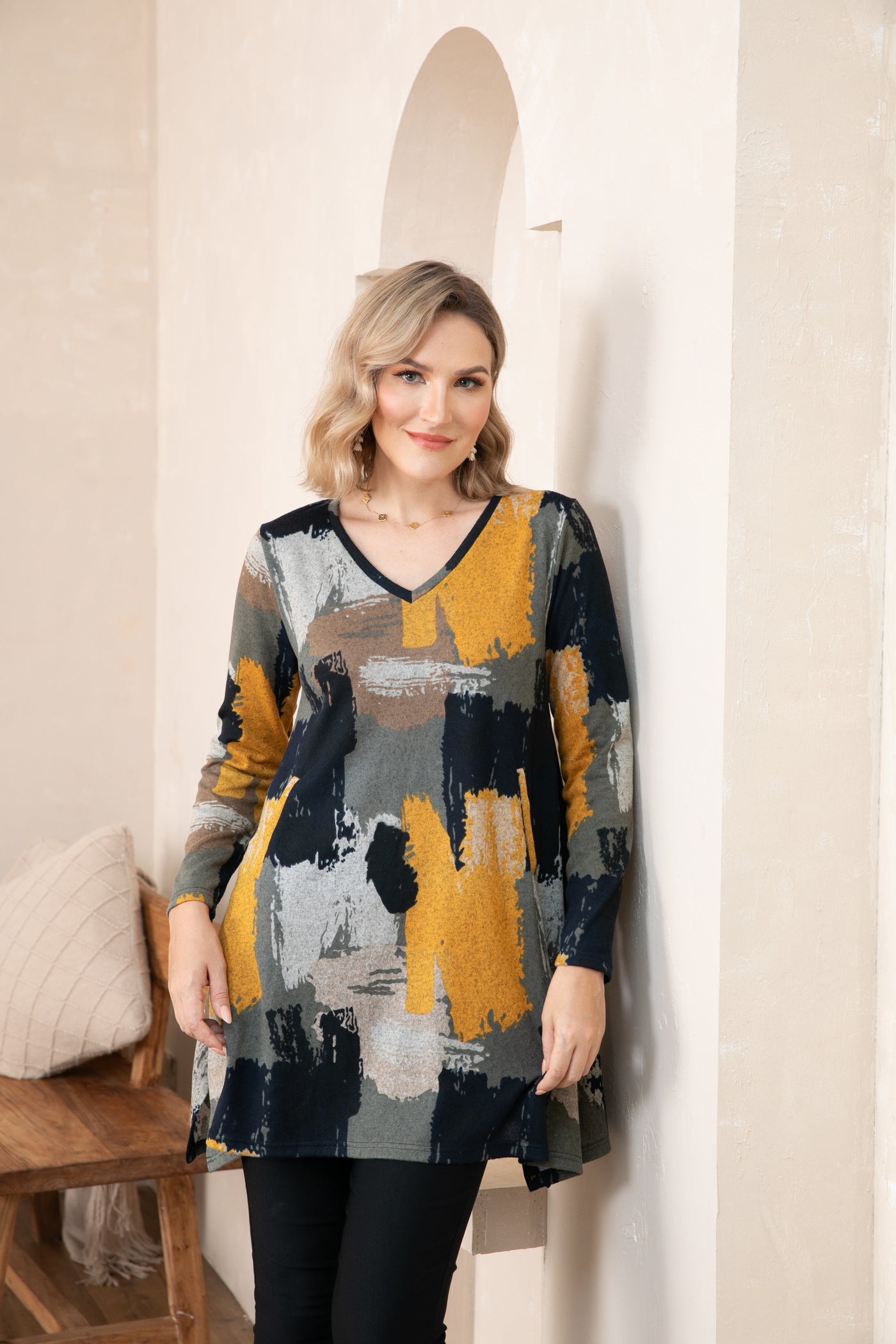 Introducing the "Artistic Essence v-neck Tunic," a contemporary fusion of abstract design and effortless style. Crafted from soft and stretchy jersey knit fabric, this tunic offers both comfort and versatility for all-day wear.