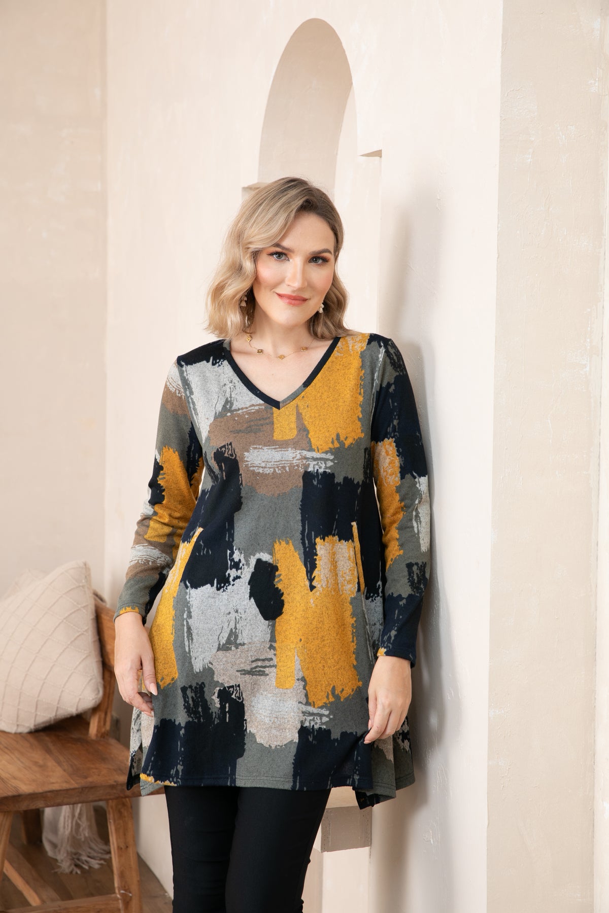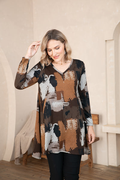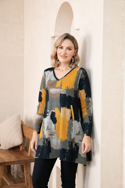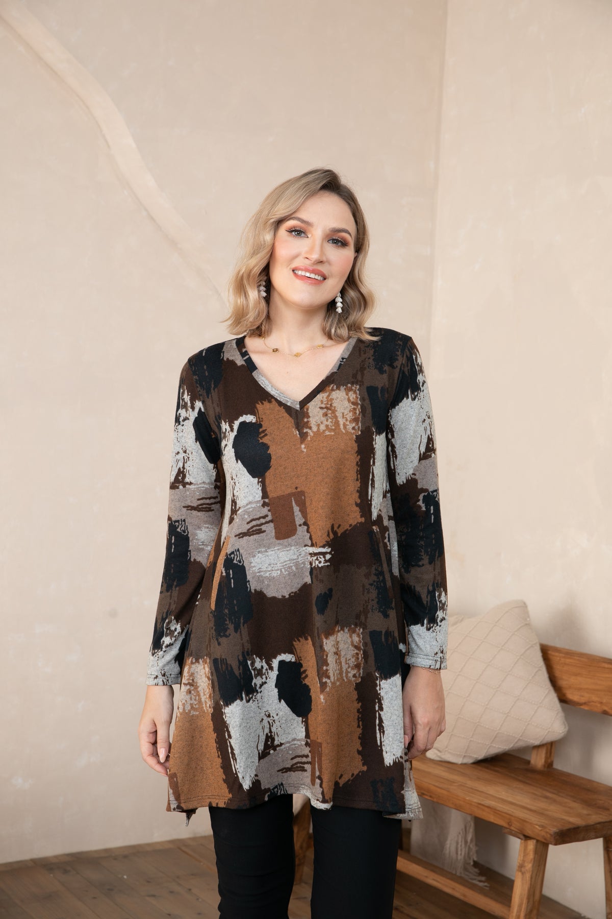 The standout feature of this tunic is its abstract pattern, which adds a touch of artistic flair to your ensemble. The V-neckline creates a flattering silhouette, drawing the eye to the neckline and elongating the figure.