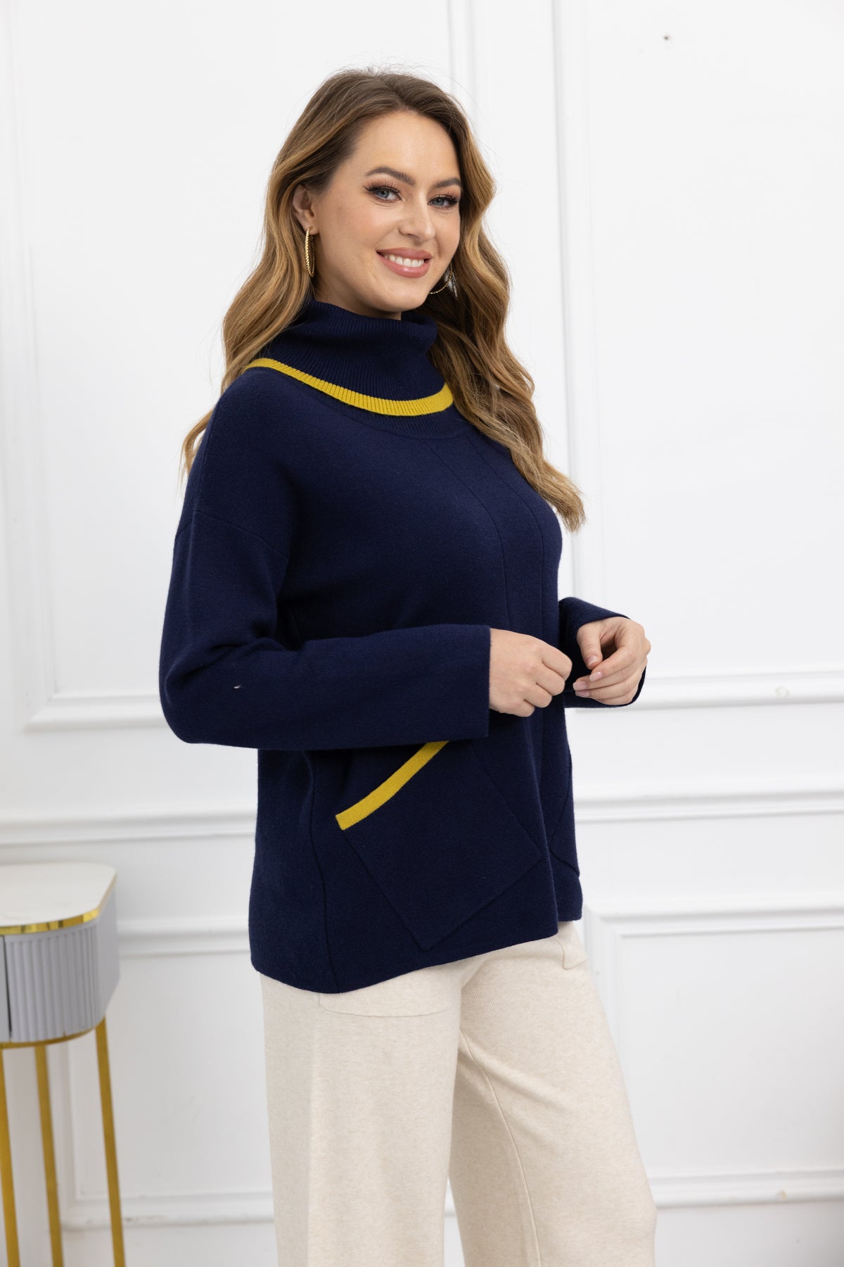 Get playful with this Turtleneck Sweater! With accent color piping and front angled patch pockets, you'll stand out in style. The soft knit and turtleneck provide warmth, while the accented front seam design adds a touch of uniqueness. Perfect for a quirky and fun look!