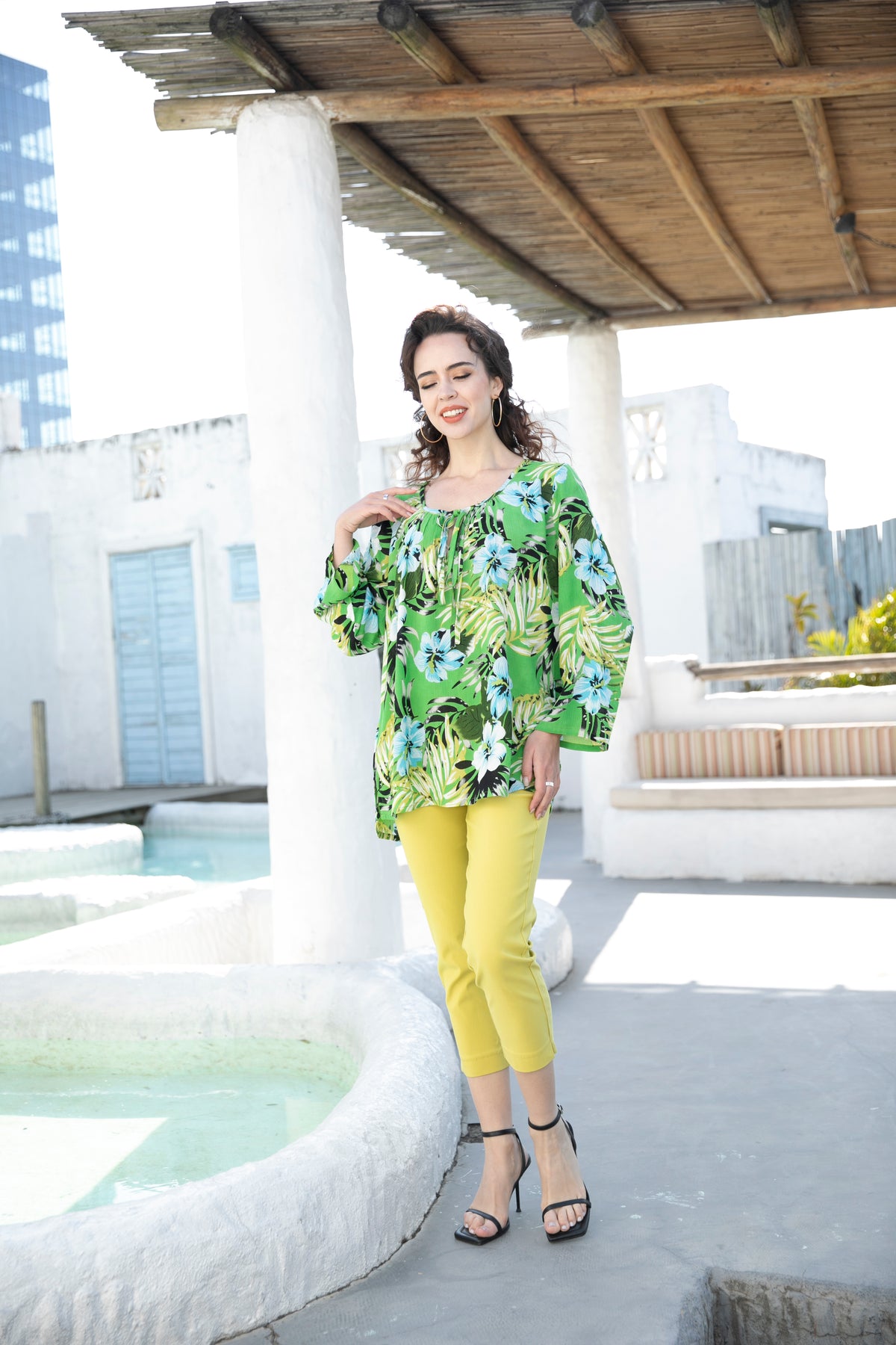 Kendall's Green Tropical Top features a vibrant printed design, exemplifying a one-of-a-kind piece of fashion.