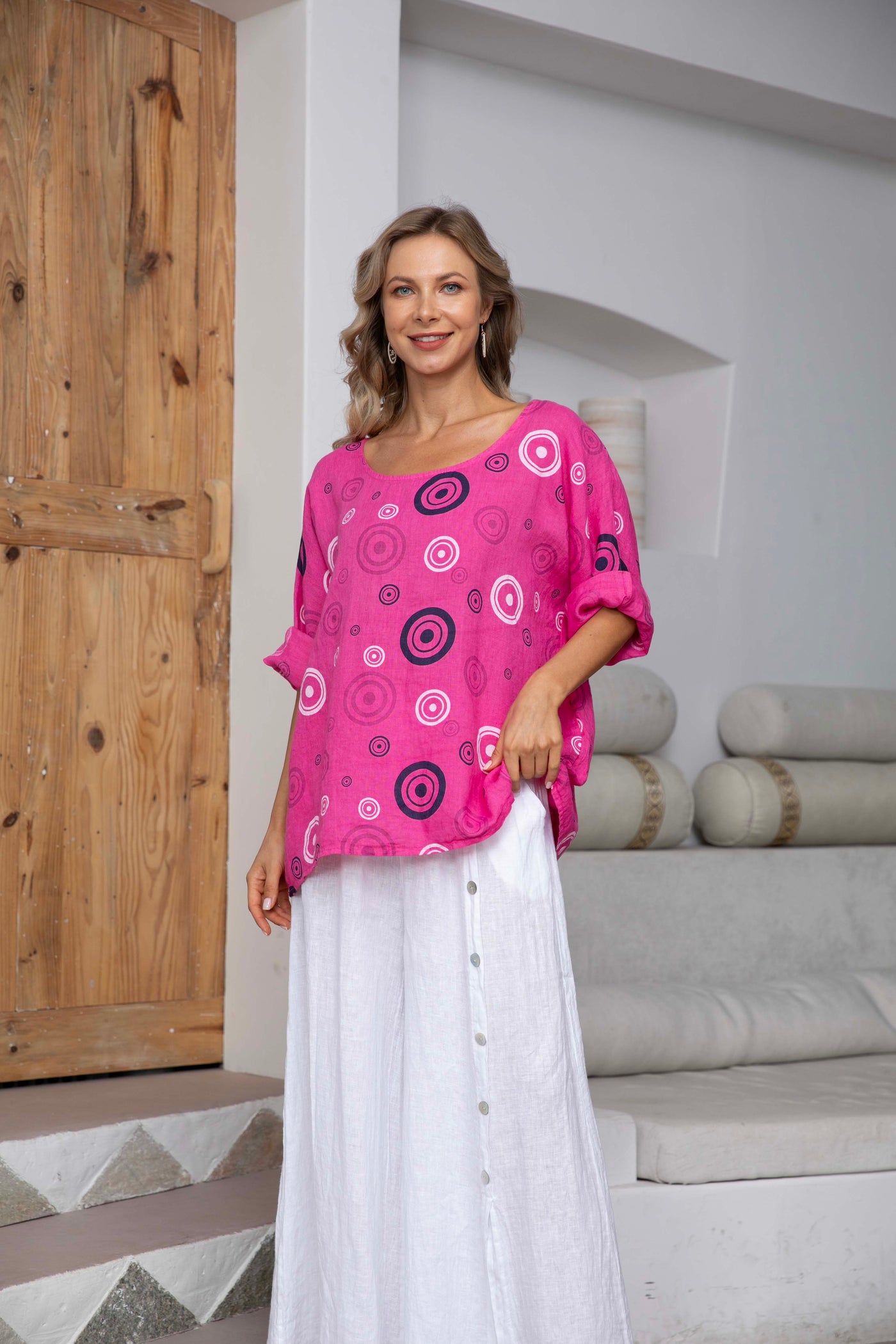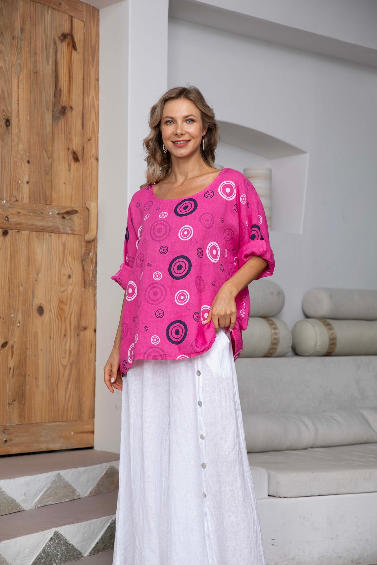 Elevate your wardrobe with our Linen Top with Circles. Made from luxurious linen, this top is both sophisticated and stylish. The intricate circle design adds a touch of artistry, making this top a must-have for any fashion-forward individual. Perfect for any occasion, this top guarantees a chic and exclusive look.