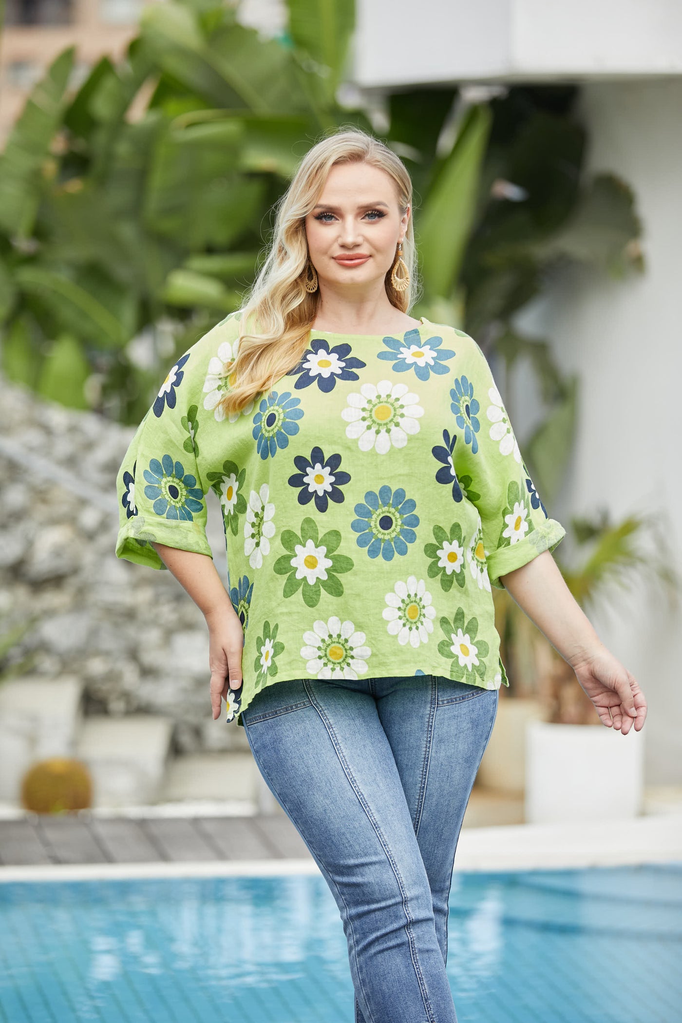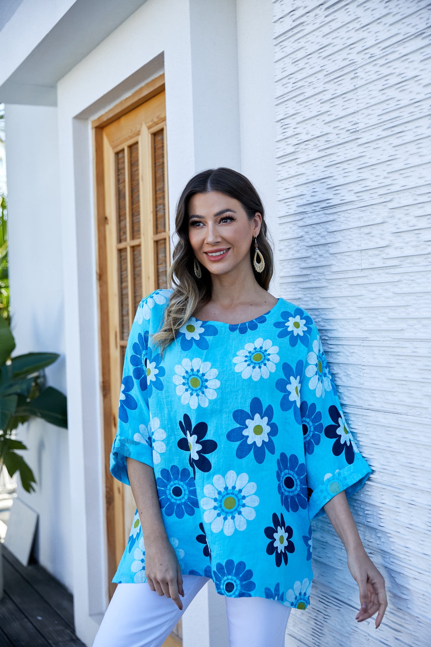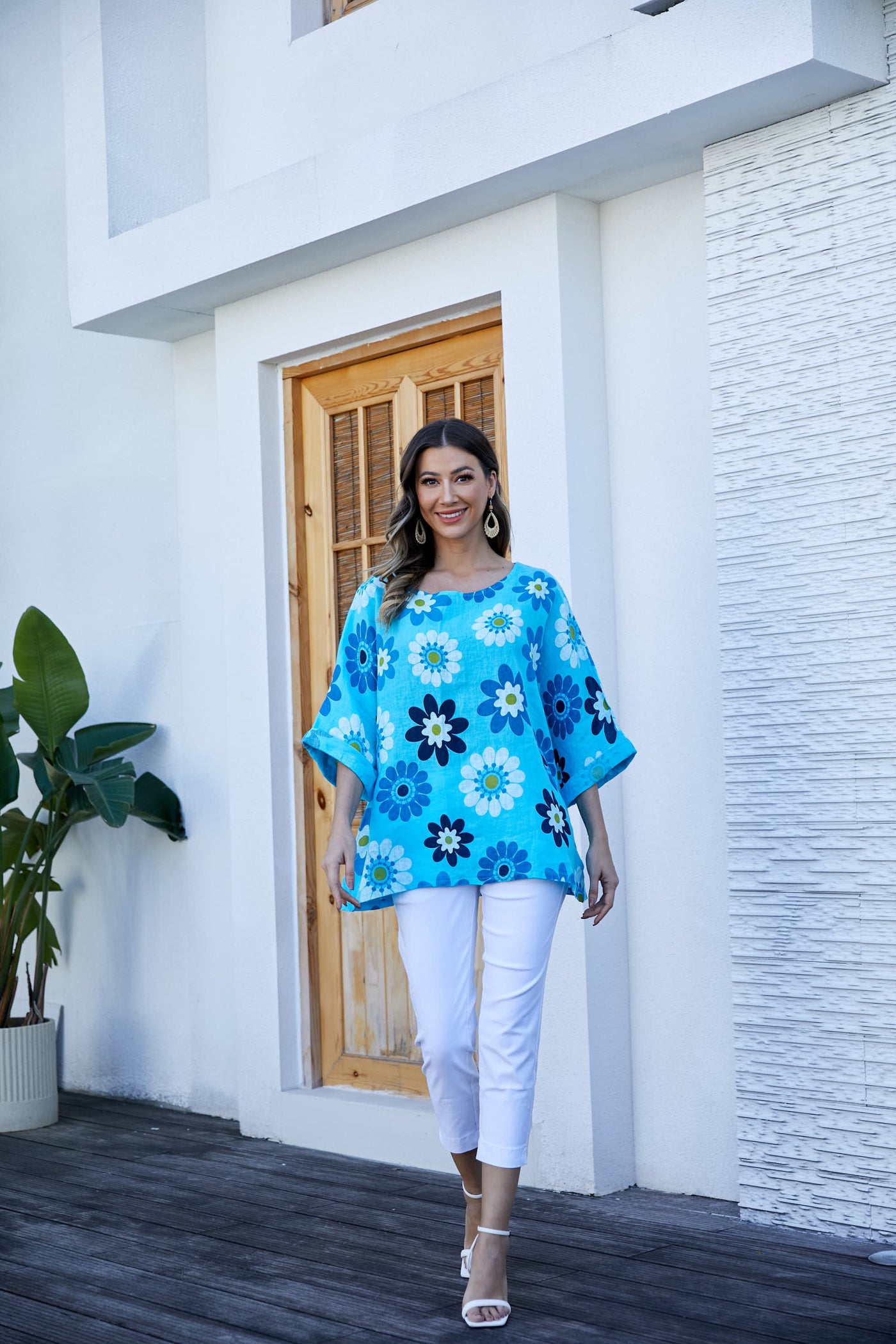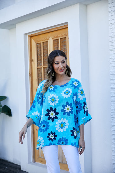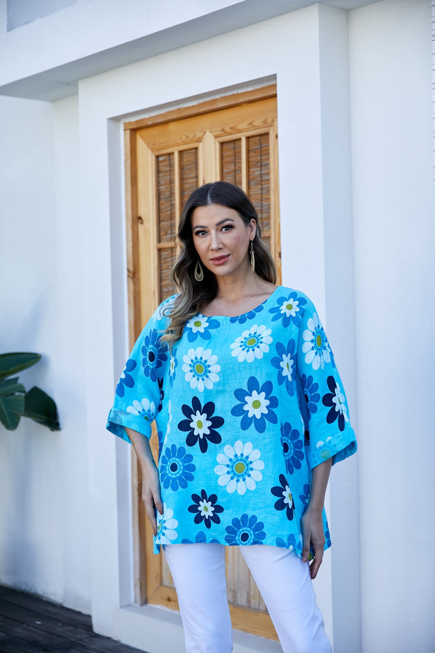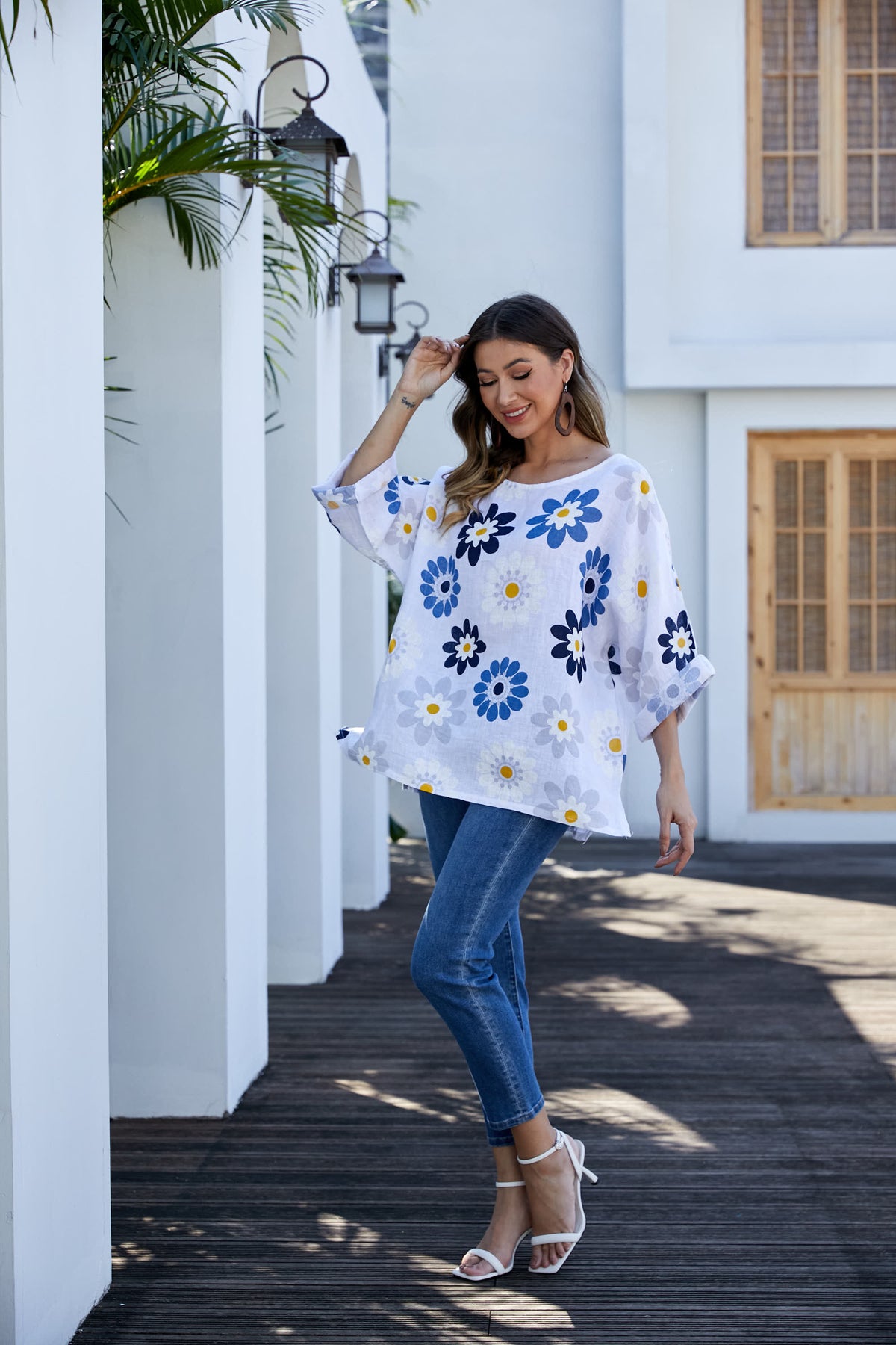 Embrace effortless summer style with the Daisy Breeze Boatneck Tee. This linen t-shirt features a charming floral daisy print and a relaxed boatneck design, complemented by 3/4 sleeves that provide a touch of elegance. With its comfy, laid-back vibe, it’s perfect for warm days and pairs seamlessly with our bamboo denim or linen pants for a chic, casual look.