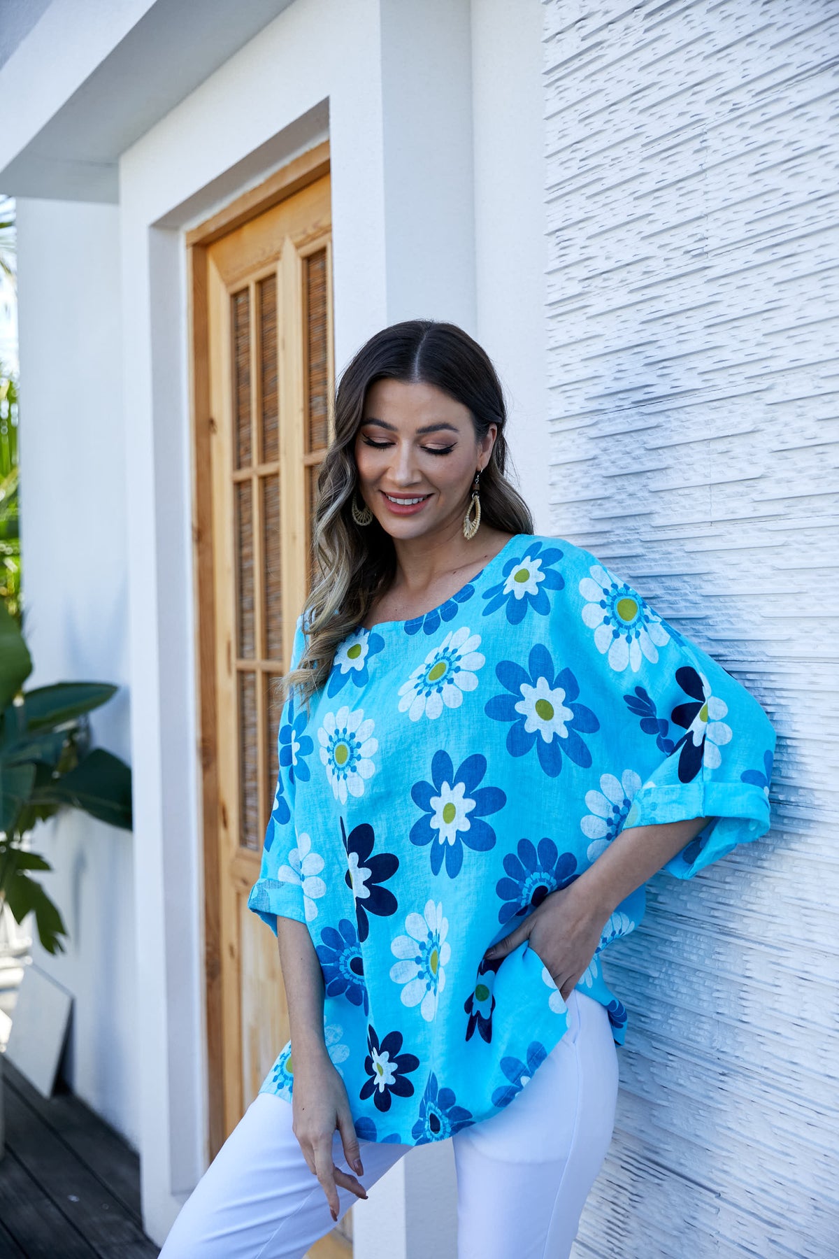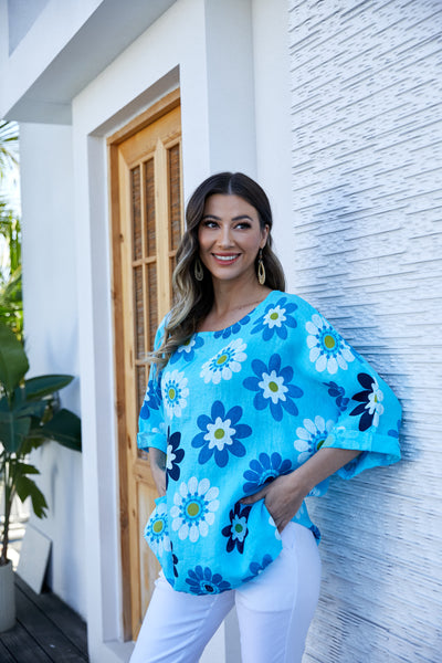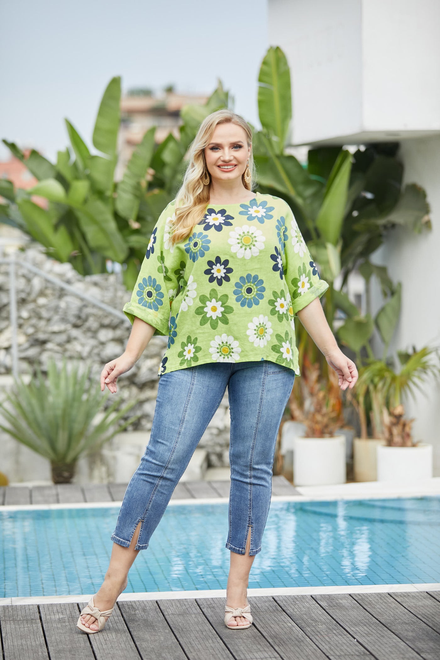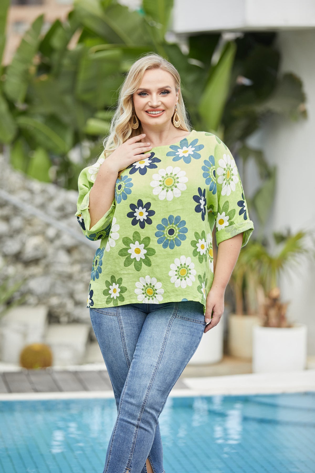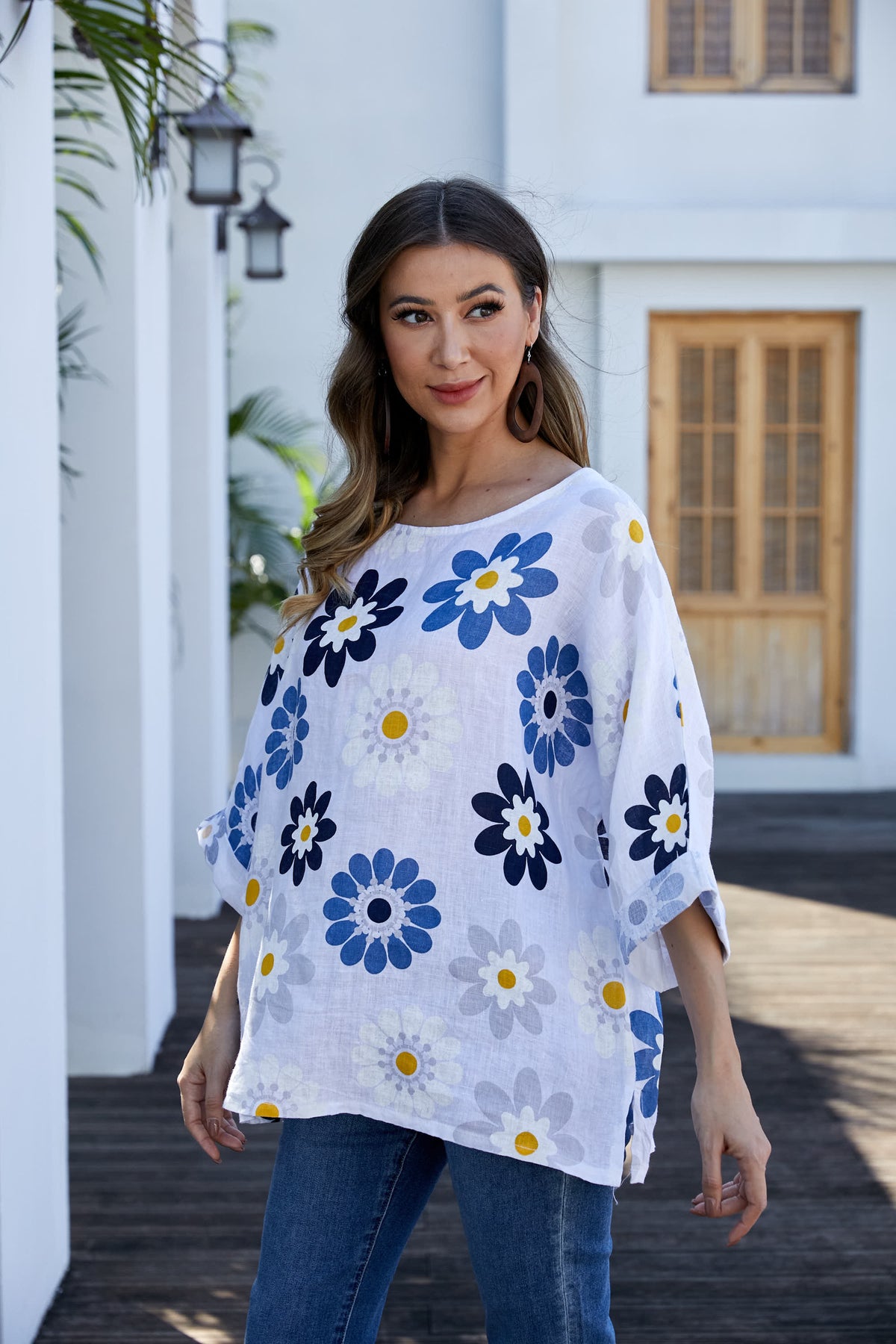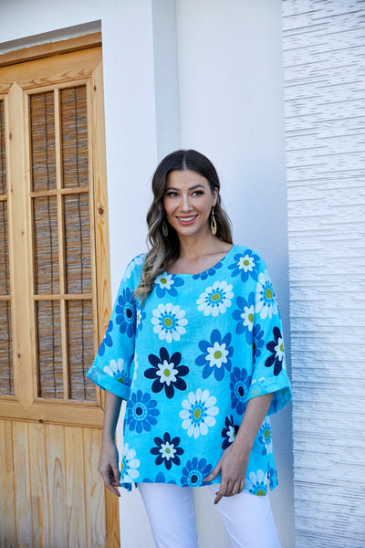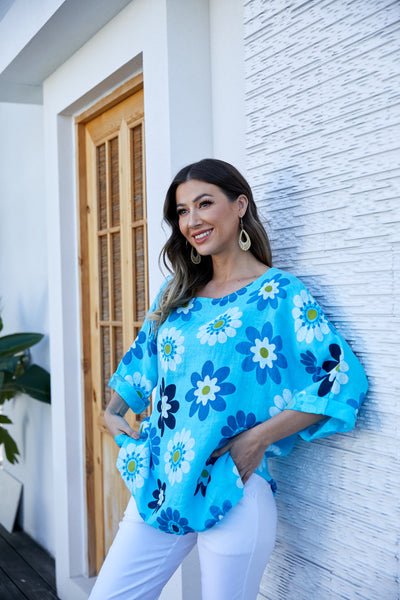 Embrace effortless summer style with the Daisy Breeze Boatneck Tee. This linen t-shirt features a charming floral daisy print and a relaxed boatneck design, complemented by 3/4 sleeves that provide a touch of elegance. With its comfy, laid-back vibe, it’s perfect for warm days and pairs seamlessly with our bamboo denim or linen pants for a chic, casual look.