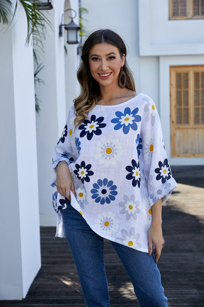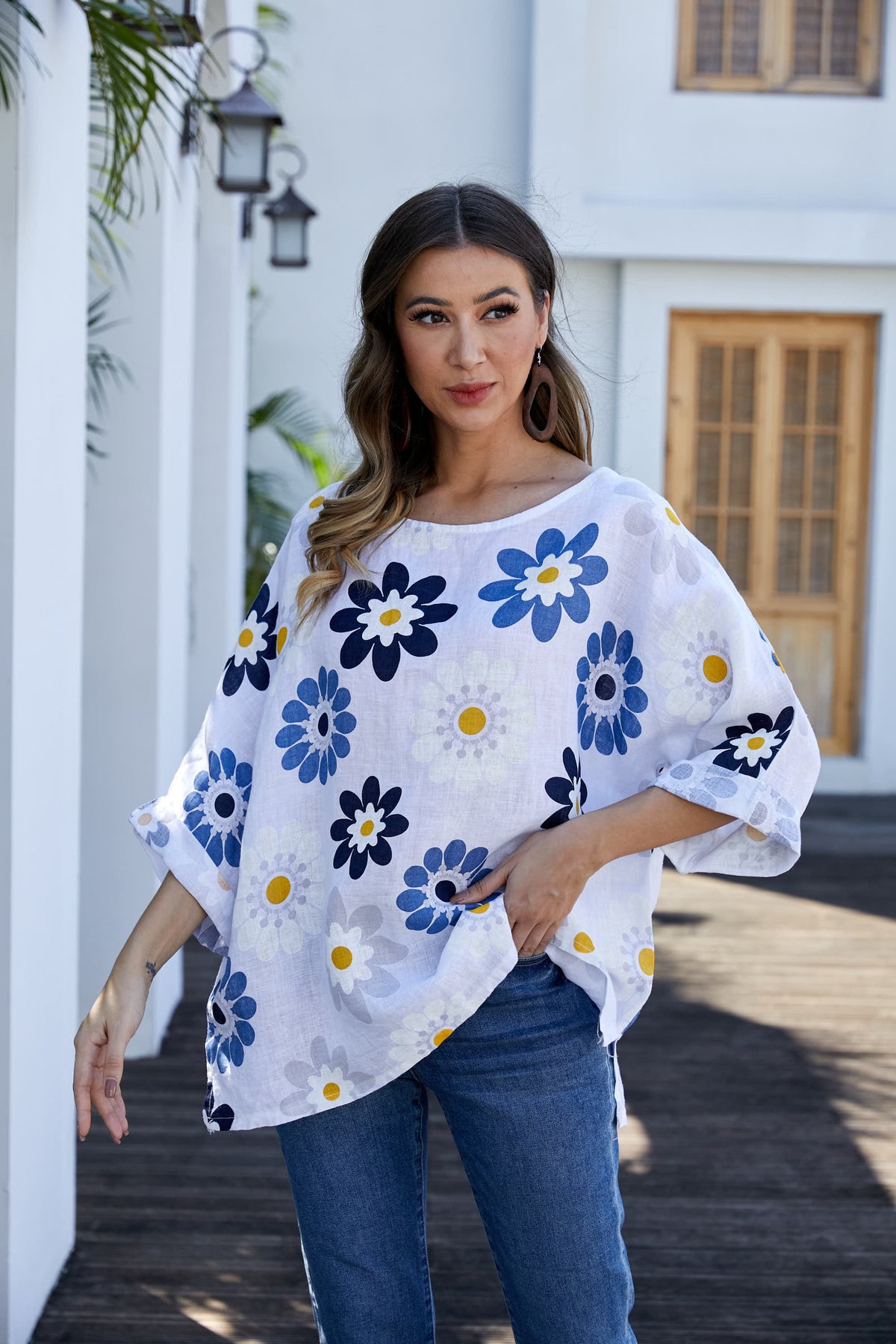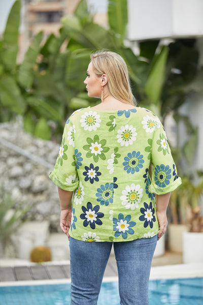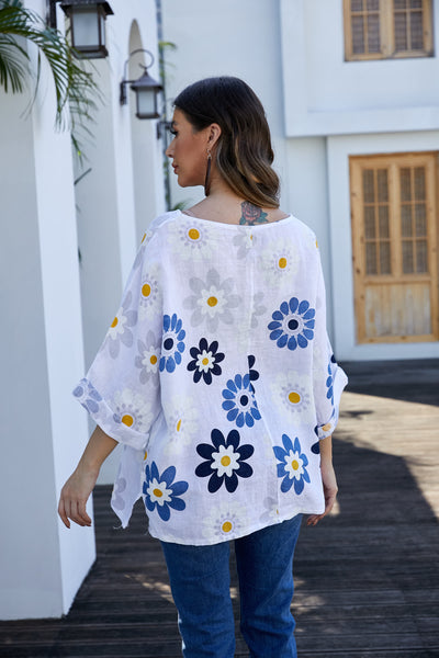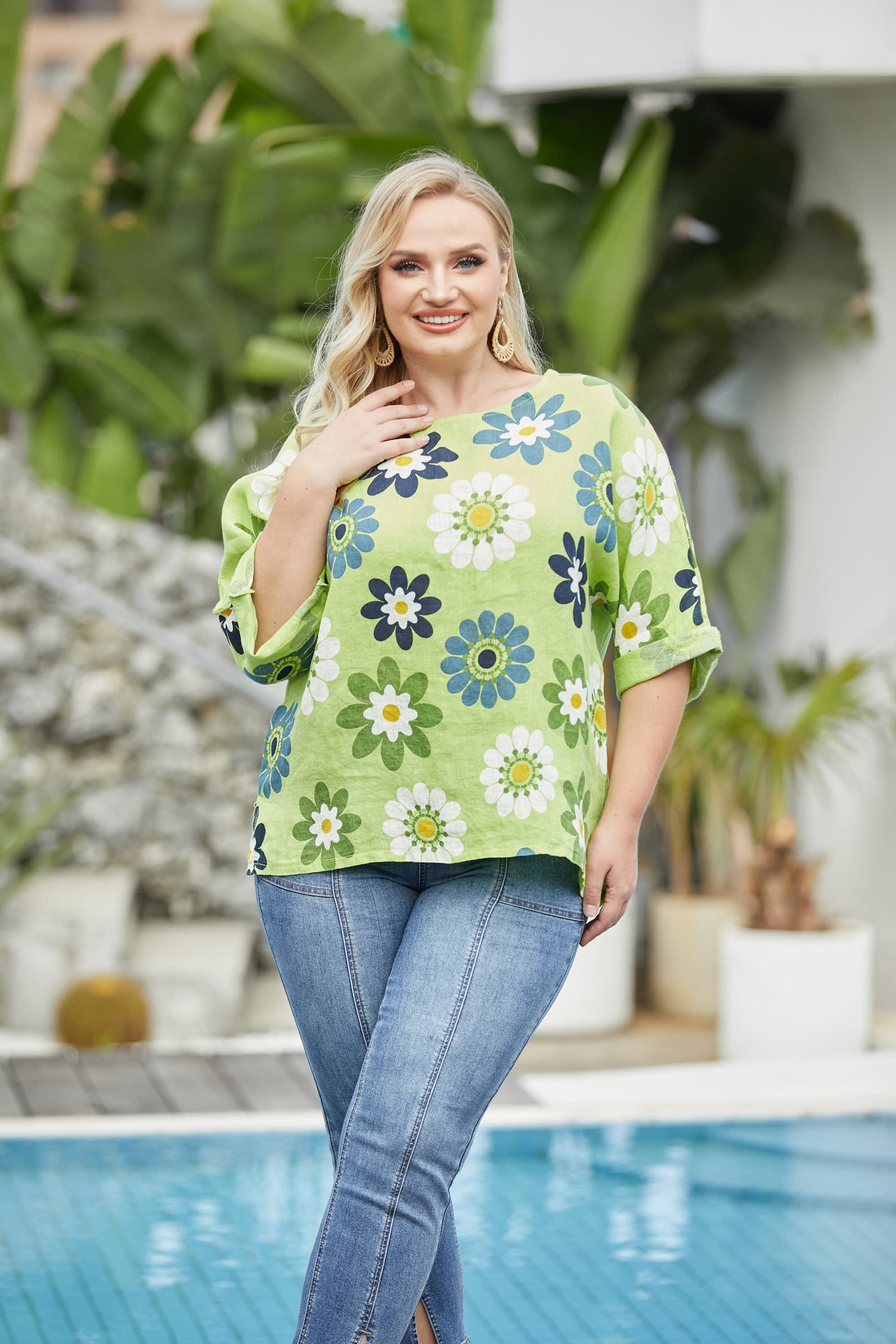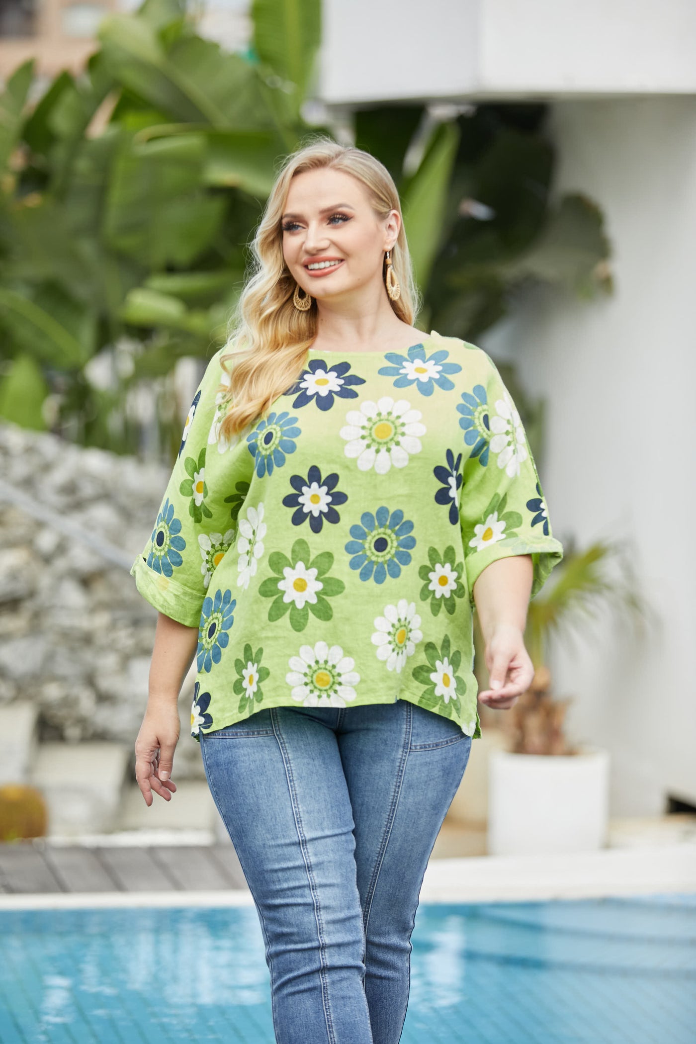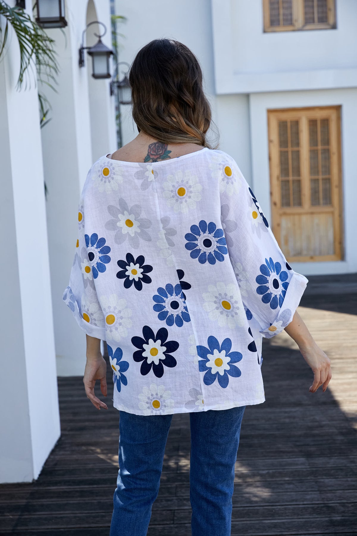 Embrace effortless summer style with the Daisy Breeze Boatneck Tee. This linen t-shirt features a charming floral daisy print and a relaxed boatneck design, complemented by 3/4 sleeves that provide a touch of elegance. With its comfy, laid-back vibe, it’s perfect for warm days and pairs seamlessly with our bamboo denim or linen pants for a chic, casual look.